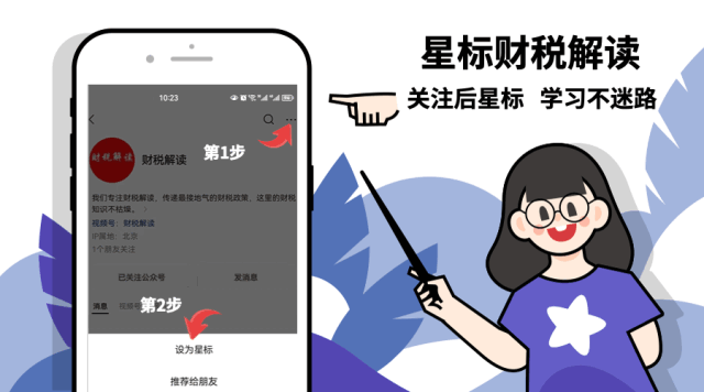方法 点击页面左上角蓝色财税解读进入主页,再点主页右上角"...",然后选择“设为星标”(账号旁显示五角星标记表示成功)。