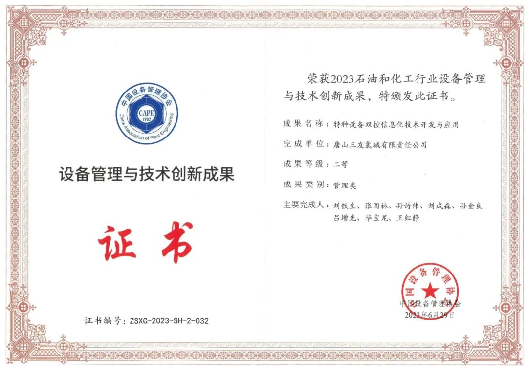 近日,氯碱公司自主开发的“特种设备双控信息化技术开发与应用”在全国设备管理与技术创新成果交流大会上获得2023年石油和化工行业设备管理与技术创新成果二等奖。