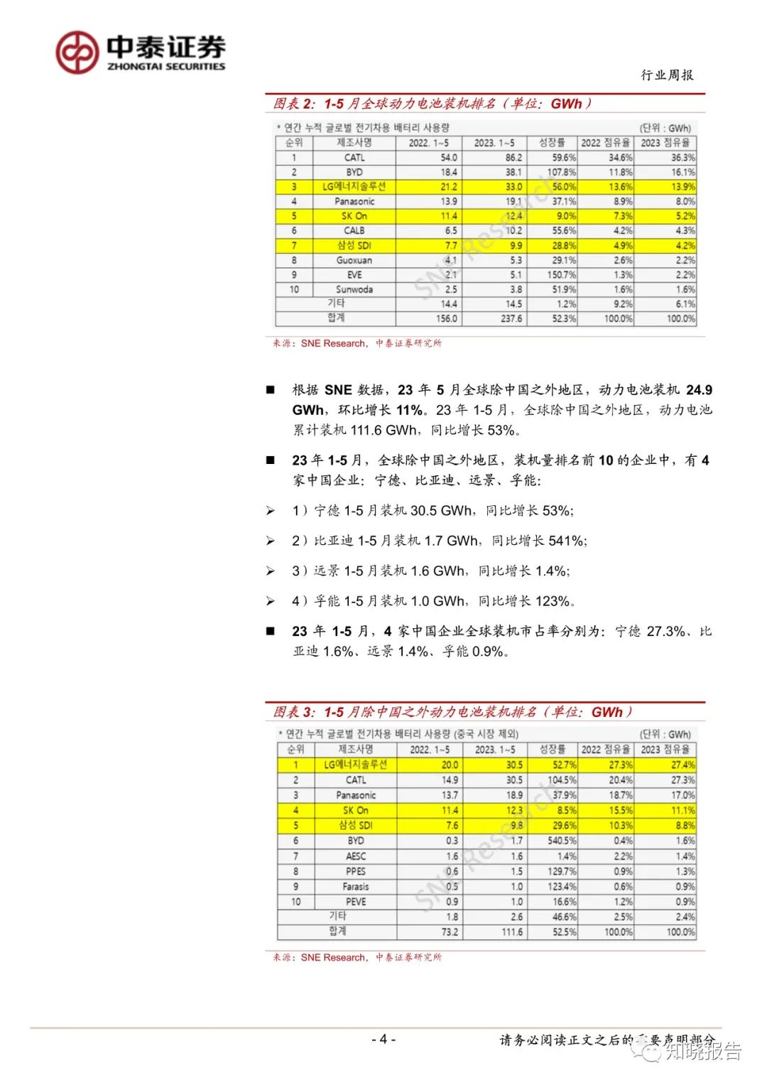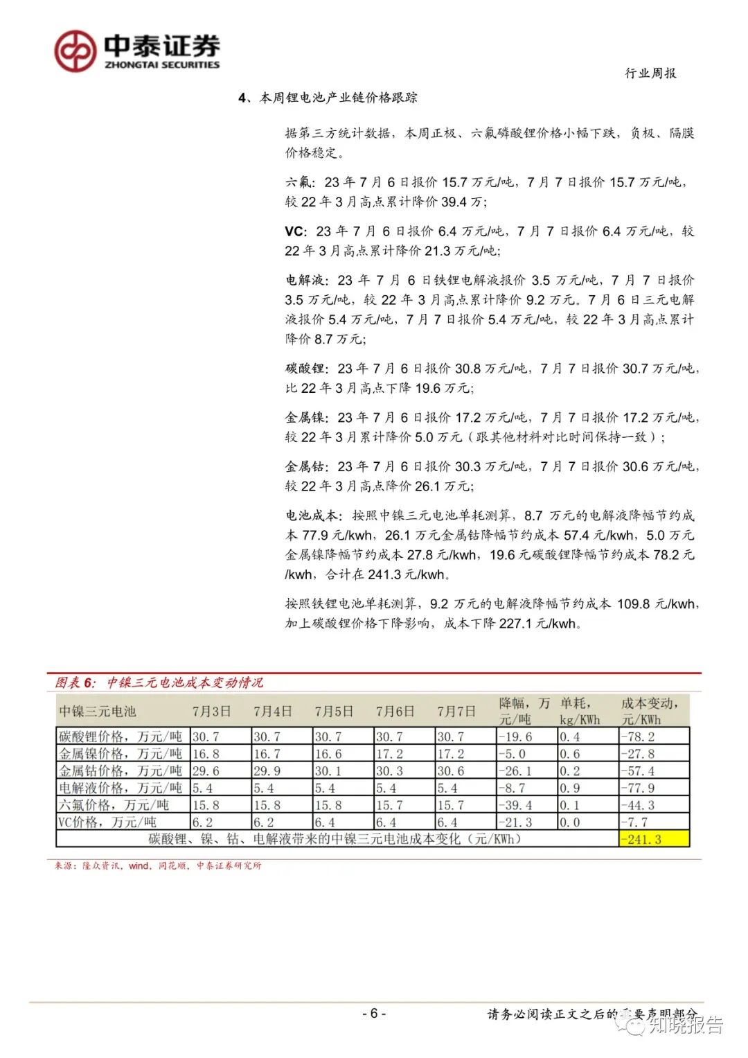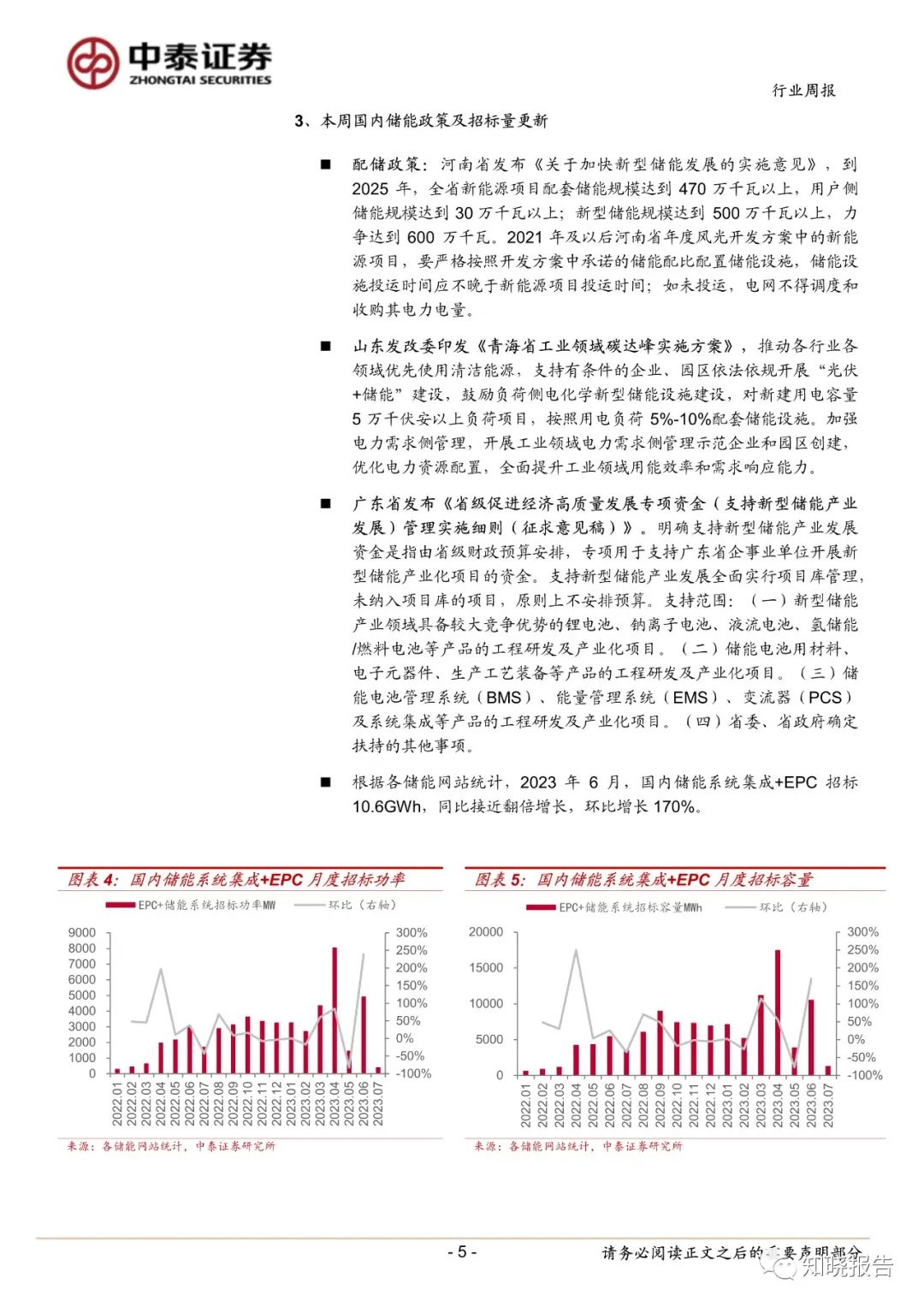 本周锂电池板块,欧洲9国6月新能源汽车销量23.5万辆,同比增长30%,环比增长23%;新能源车渗透率23.9%,同比提升2.3 pct,环比增长1.9 pct。根据SNE数据,23年5月全球动力电池装机55.1 GWh,同比增长64%,环比增长11%。23年5月全球除中国之外地区,动力电池装机24.9 GWh,环比增长11%。根据各储能网站统计,2023年6月,国内储能系统集成+EPC招标10.6GWh,同比接近翻倍增长,环比增长170%。