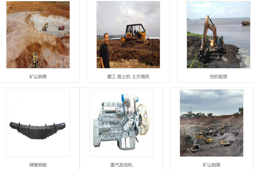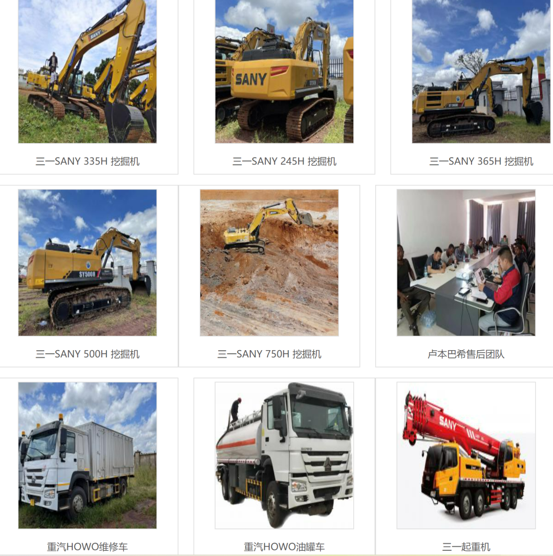 主要包括:三一液压挖掘机、起重机、压路机、装载机、混凝土搅拌站、混凝土泵车;中国重汽自卸车、拖头和低板、洒水车、油罐车、轻卡;厦工的装载机、平地机、推土机、叉车等,是中国在刚果金最大的工程机械代理商,所代理的三一重工是中国工程机械在刚果金等第一大品牌。