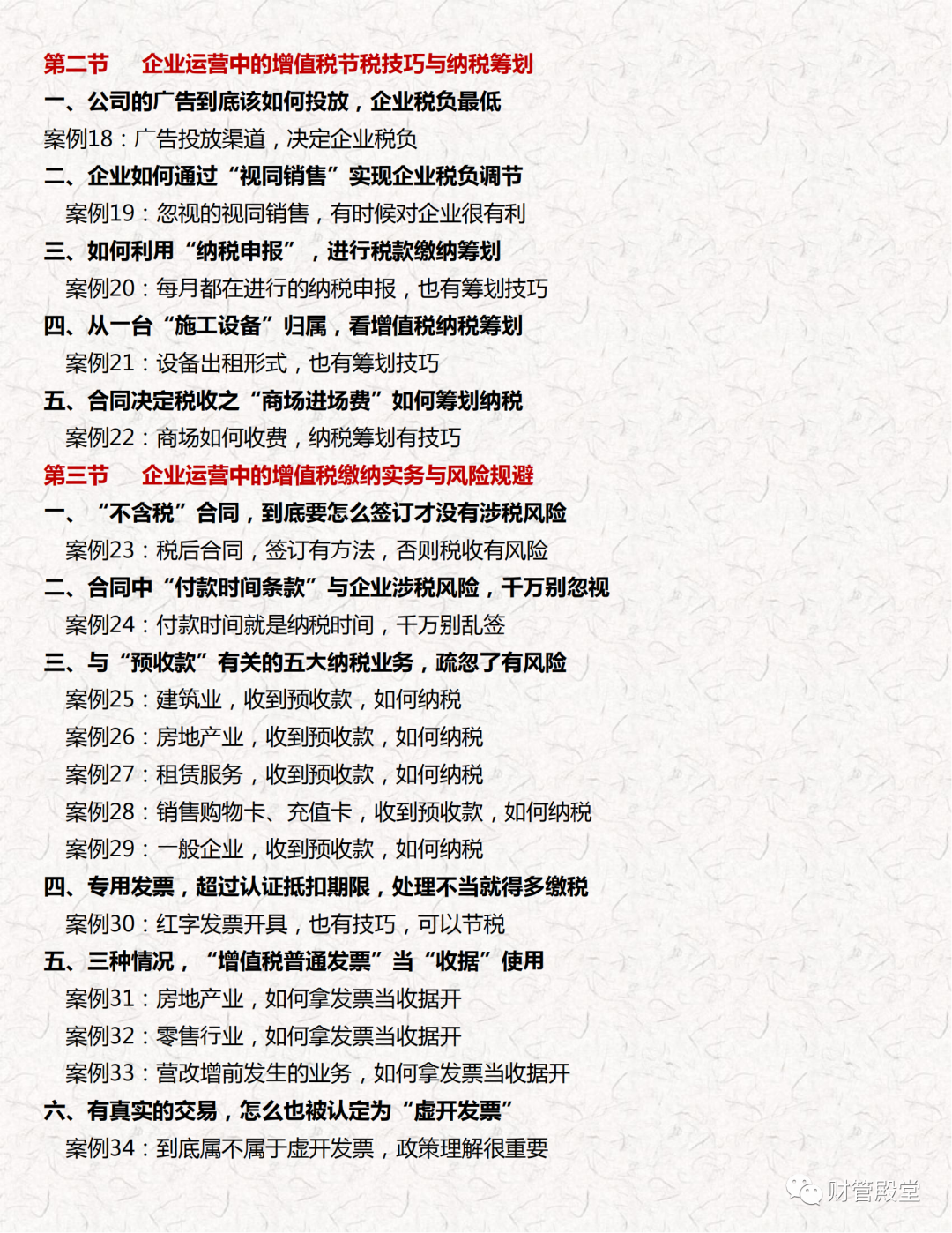 以上是107个税务筹划实践案例的部分内容展示,因为内容较多,全文有400多页呢,今天我们先主要来看看公司业务中涉及的主要税种增值税在缴纳环节常用的税务筹划思路是什么?