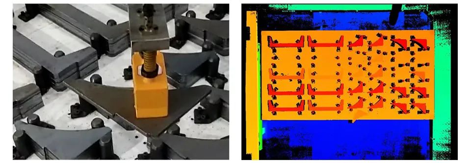 通过引入海康机器人3D视觉引导解决方案,助力客户实现车头预制线自动化装配任务。其来料托盘规格大,要求相机在覆盖大视野范围的同时,保证极高的定位精度;车架零件存在表面锈迹、油污,此外,现场光线干扰较强,对3D相机的成像能力有较高要求;此外客户生产的车架种类繁多,且每种车架涉及的零件数量较大。现场需要引导定位的零件种类达数十种,因此需要3D视觉系统具有较强的兼容性。