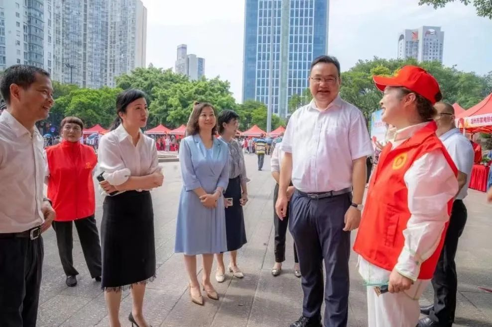 (市委两新工委、市委直属机关工委、市工商联、鹿城区工商联领导到现场看望参加活动的志愿者及市民群众)