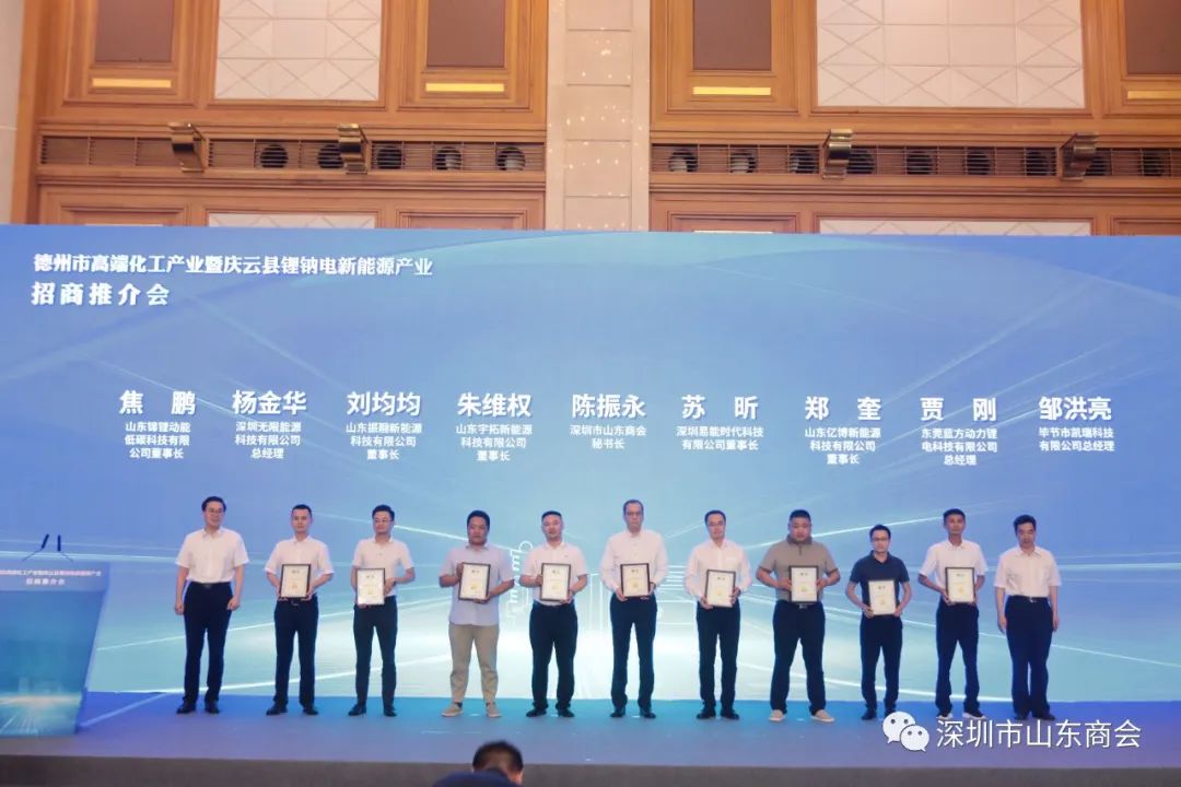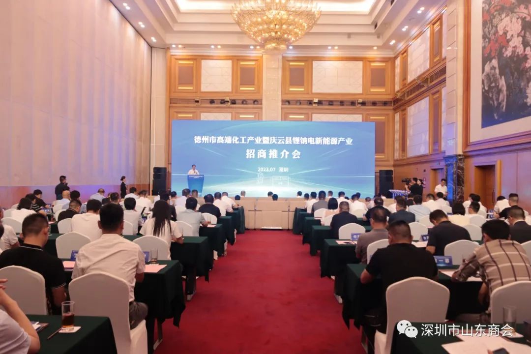 7月20日下午,德州市高端化工产业暨庆云县锂钠电新能源产业招商推介会在深圳举行。德州市委副书记苑衍刚,德州市委副秘书长、德州市档案局局长朱振东,德州市工信局党组书记、局长、二级巡视员孙洪昌,德州市庆云县县委书记刘涛等出席会议。我会会长王立新,执行会长兼秘书长梁庆伟,执行秘书长陈振永等受邀参加了会议。