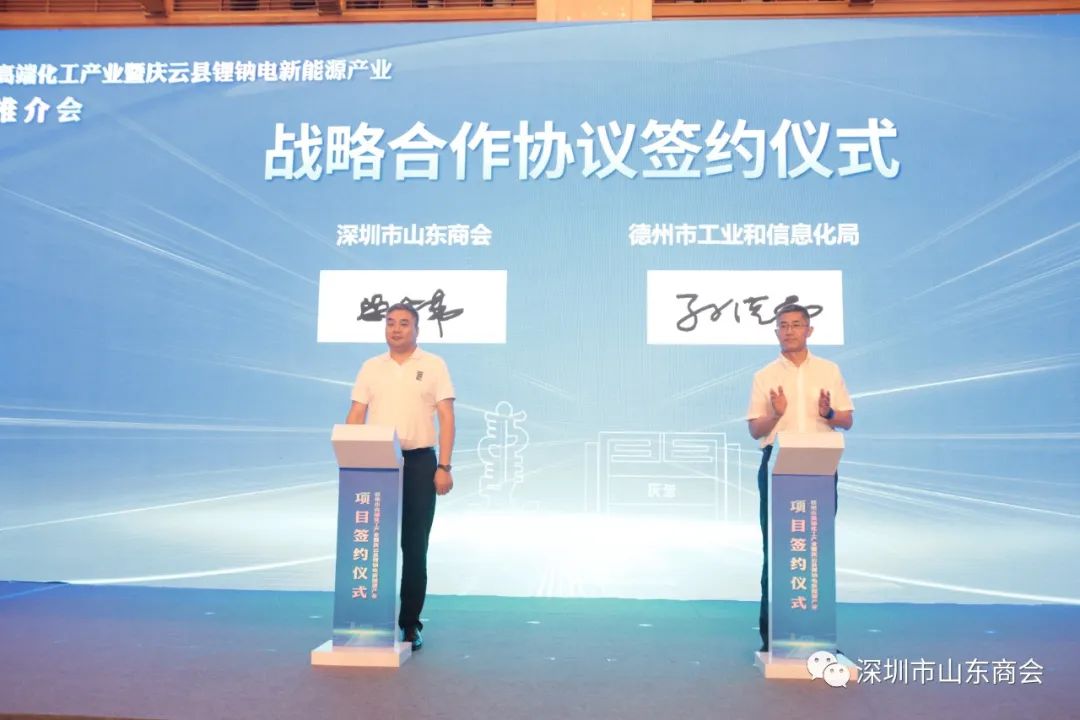 王立新会长在致辞中表示,德州区位优越,交通便利,自古就有“九达天衢”、“神京门户”之称,是全国重要的交通枢纽。多年来,德州市委市政府全面贯彻新发展理念,全力打造优势产业链,使得工业基础更加扎实、配套设施更加完善、营商环境更加优越。特别是近几年,德州市委市政府大力实施先进制造业强市战略,全方位推进高质量发展,在做强做大传统优势产业地同时,不断培育新产业、新经济。高端化工企业华鲁恒升、庆云县钠锂电新能源产业就是其中的代表。庆云县地处环渤海经济圈,多重战略机遇叠加。境内3条国道、高速纵横,高铁、机场环绕周边,交通便利。锂钠电新能源产业基础雄厚,特别在新能源汽车充电桩方面,拥有电力装备、民营加油站等独特优势,绿色能源合作发展潜力巨大。深圳市山东商会成立于2012年,成立十多年来,商会秉承“服务会员、服务家乡”两大服务,为在深企业家和山东地市“双招双引”工作做出贡献。未来,深圳市山东商会将继续加强与德州的互动联系,积极助力德州经济社会高质量发展。
