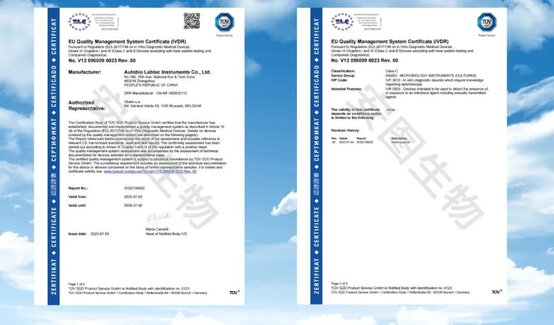 近日,安图生物全自动微生物质谱检测系统Autof ms系列获得欧盟公告机构颁发的IVDR class C类注册证书,这是国内首张欧盟IVDR微生物质谱检测系统产品注册证。