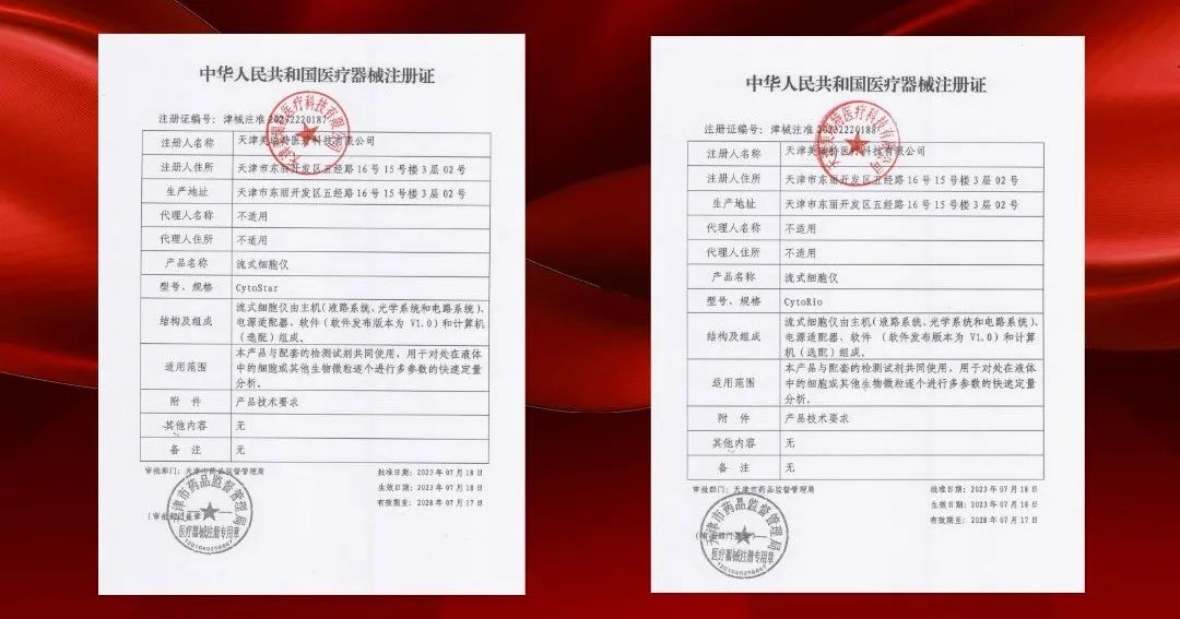 7月18日,天津美瑞特医疗科技有限公司同时获得双激光CytoStar、单激光CytoRio流式细胞仪注册证。