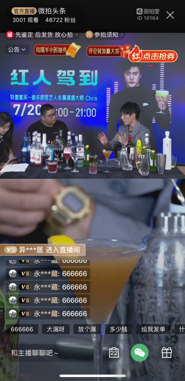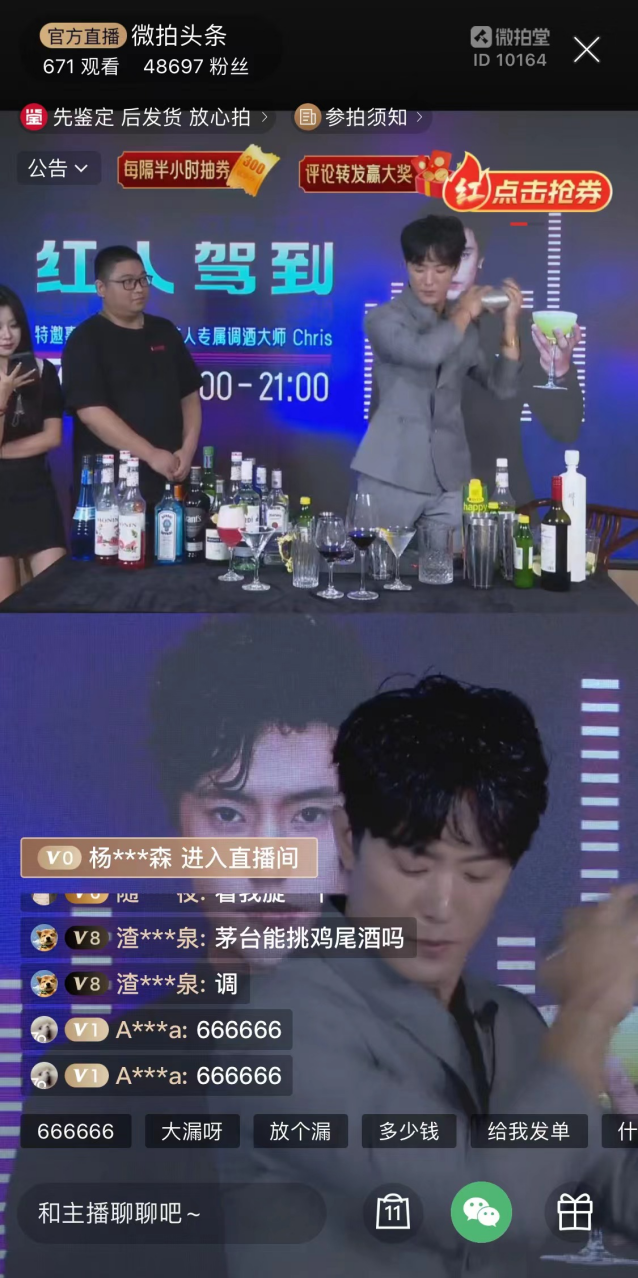 直播开始不久,Chris就进行了一波“王炸”,向粉丝秀出了自己高超的调酒技巧,让直播间瞬间活跃起来,粉丝说道,这种在偶像剧里才会出现的场景,没想到在微拍堂里看到了。