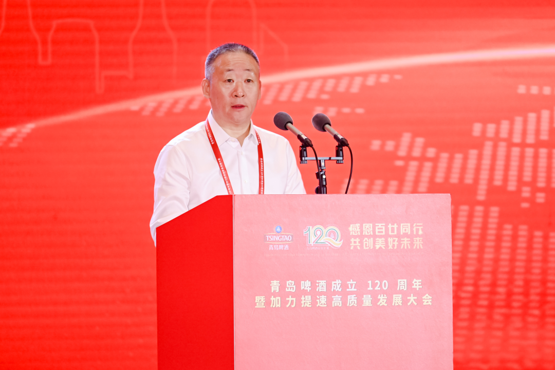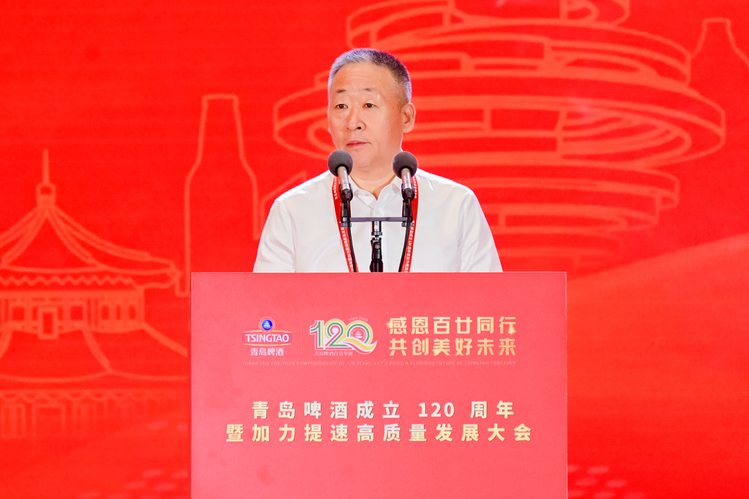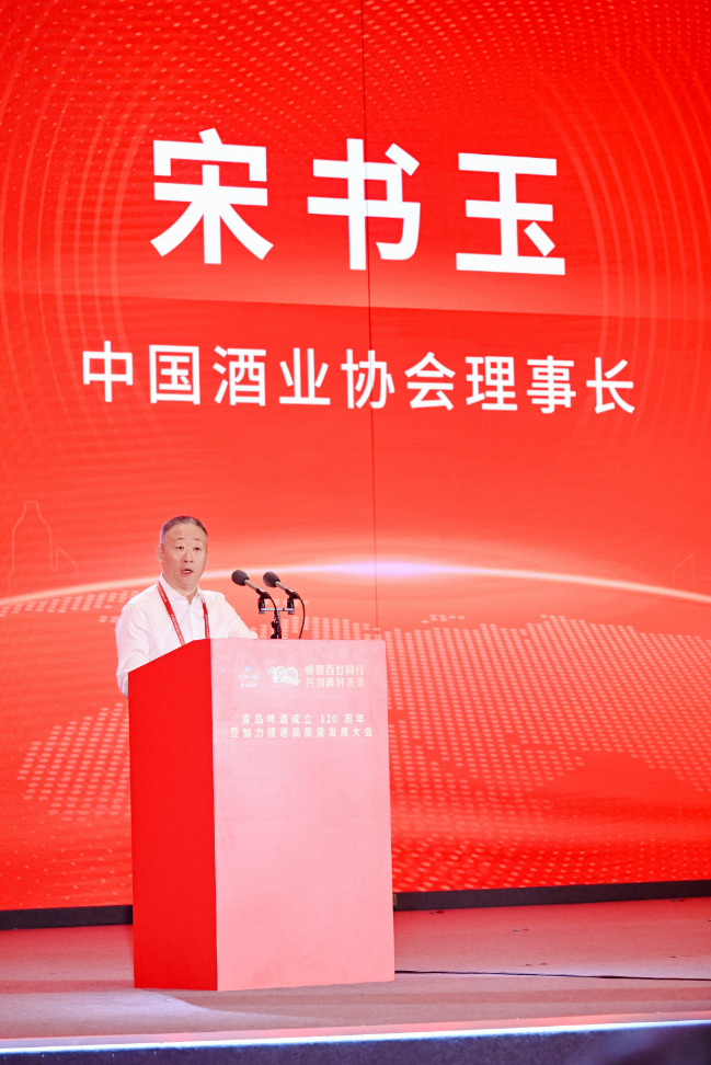 7月22日,青岛啤酒成立120周年庆祝大会举行,中国酒业协会理事长宋书玉,名誉理事长王延才,秘书长何勇,办公室主任赵婷,啤酒分会秘书长元月出席庆祝大会。宋书玉理事长发表致辞,对青岛啤酒成立120周年献上祝贺。一百二十年,在一个地方,做一件事。不是所有人能够做到的。青岛啤酒人做到了。正是因为,无论什么民族,无论什么肤色。热爱生活,赞美生活,向往美好是人类共同的追求。一百二十年从德国啤酒青岛酿,到今天,青岛啤酒世界香。这是人类文明的进步,这是属于青岛人,属于青岛啤酒人的荣耀。青岛啤酒以城成名,青岛这座城市又以酒而兴。青岛与青岛啤酒相爱相守,相互成就。这是人间烟火的成就,亦是城市的荣光,更是青岛人豪情,爽朗,情谊,礼仪的写照。是青岛人留给我们的美好印象。青岛因此而骄傲。青岛啤酒因此而自豪。好人酿好酒是青啤人的核心酿造观。什么是好人?很难有标准答案。什么都没有做的人,一定没有资格来回答。独善其身的人也没有资格来评判。文化背景,价值取向,时代特征,信仰与追求。没有经历岁月洗礼,很难给出答案。经历了一百二十年的青岛啤酒人。酿了一百二十年好酒的青岛啤酒人,才有勇气说,好人酿好酒。作为酿造美好的酿酒人,我以为的好人,必须具备四个条件,那便是:修身、济世、酿善、载道。修身体现在为什么而酿,什么人才可以酿。以德而酿是青啤人的酿造初心,立德之人才可以酿。酿造之初便以追求表达人之德性。所以,青啤人才能从只酿合格品,到今天只酿优质品。立标,立规。育人,育心。自律、自觉做好酿酒的每一件事情。每个青啤人都要做到立德修身,心静如水,心无旁骛,只为酿好酒。济世体现在家国情怀,社会责任。为国家而酿,为美好生活而酿。感恩,回报是永恒的信条。精选一粒粮,回报一片地,精选一滴水,回报一条河,用了一度电,回报一片林。回馈自然,回馈生态,让绿色生态酿造植入每个青啤人的心中。坚持绿色生态酿造。以科技创新引领青啤快速走向零碳,负碳。为全球生态美好发展贡献青啤力量,青啤智慧。酿善是对品质无限的追求,是匠人,匠心的精益求精。是酿酒大师的人才辈出。从品质安全,到品质构成,从质量保障,到质量特色,从质量能力到品质魅力。青啤人创造了好人酿好酒的魅力感知质量。让每个消费者能够感知到青啤的魅力质量。这背后是青啤人坚持科技创新驱动品质不断升级的硕果,是青啤人敢于站立世界啤酒发展的前沿,工艺创新,风味创新,品类创新,消费创新的硕果。载道,何以载道,文以载道,文以传道。青啤一百二十年走到今天得以中国优秀酒文化的传承与弘扬。下一个一百二十年依然如此。文化是灵魂,是生命。品质的最高境界无疑是文化极致。中国是人类酿酒的源头,啤酒也不例外,糵造醴,便是人类最早的啤酒。说青岛是中国现代啤酒工业的发祥地之一。也可以说青岛啤酒是中国糵造醴的延续。现代啤酒工业根植有着深厚文化底蕴的中华大地,汲取丰富的中国文化营养,一定会绽放出更加绚丽的色彩。青岛啤酒就是真实的写照。青岛酿酒人是中国优秀文化的实践者,弘扬者,创新者。青啤人正以场景营销创新让消费者感受青啤的魅力之美,青啤人正以更好的品质让消费者赞美更加美好的生活。一瓶酒,一座城给我们讲述了一个好人酿好酒的故事。这个故事虽然续写了一百二十年,也许属于她的精彩才刚刚开始。好人酿的好酒,我们要喝。好酒是好人酿的,我们当然要喝。好人酿给好人的好酒,我们必须要喝。祝愿青岛啤酒下一个一百二十年后,依然青春靓丽,依然充满活力,依然是好人酿的一杯好酒。