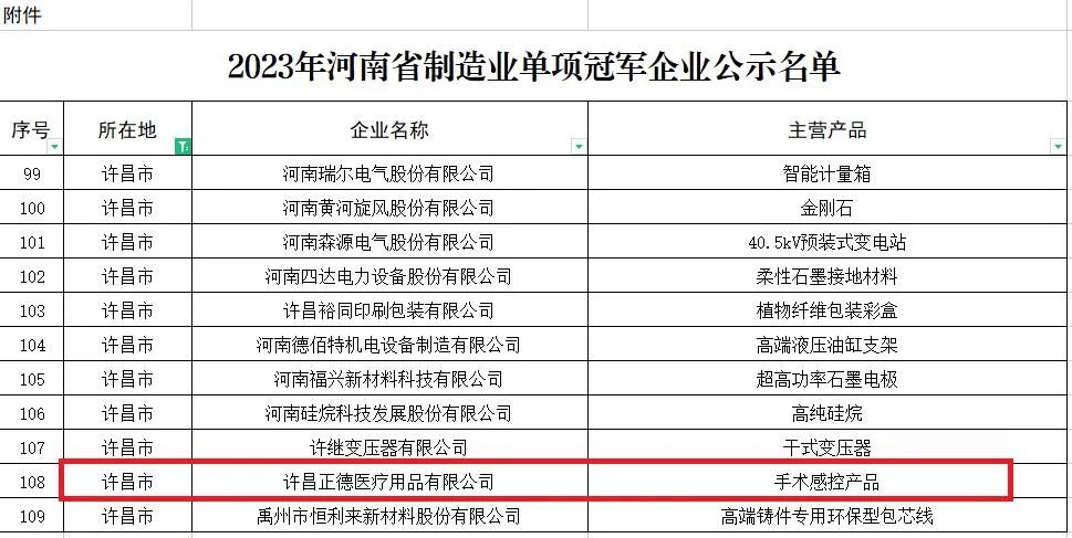 近日,省工业和信息化厅公布2023年河南省制造业单项冠军企业名单,许昌正德医疗用品有限公司榜上有名,连续两年入选河南省制造业单项冠军企业。