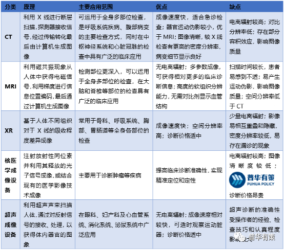 医学影像设备是通过 X 射线、电磁场和超声波等介质帮助医生对病变部位进行定位、定量和定性的判断的一种医疗设备,是辅助临床疾病诊断的重要手段。依据设备大小和成像机制的不同,临床常用的医疗影像设备通常可以区分为 CT、MRI、XR、核医学诊断设备等大型医学影像设备以及超声成像设备和内镜等小型医学影像设备。