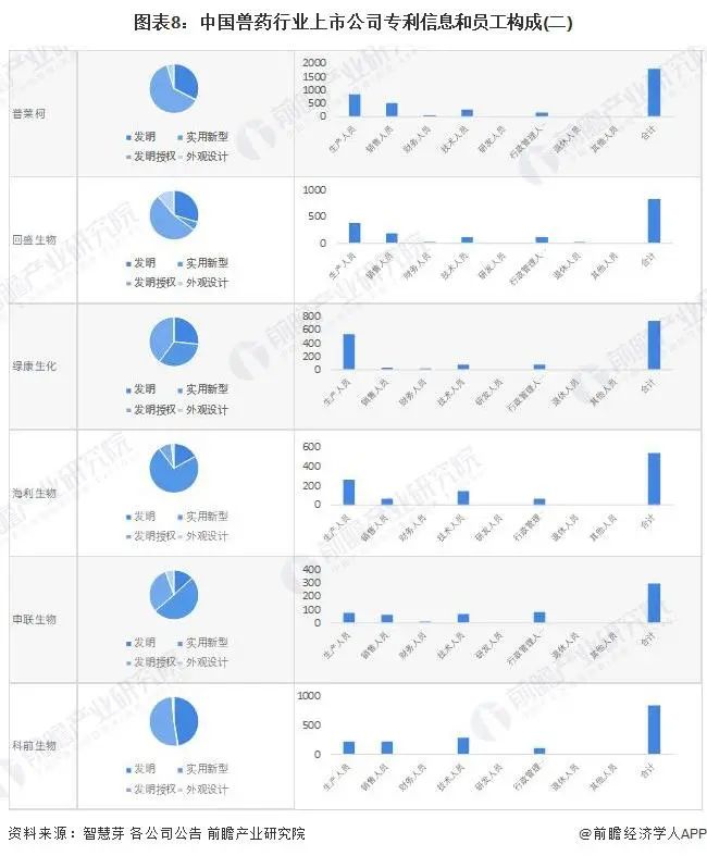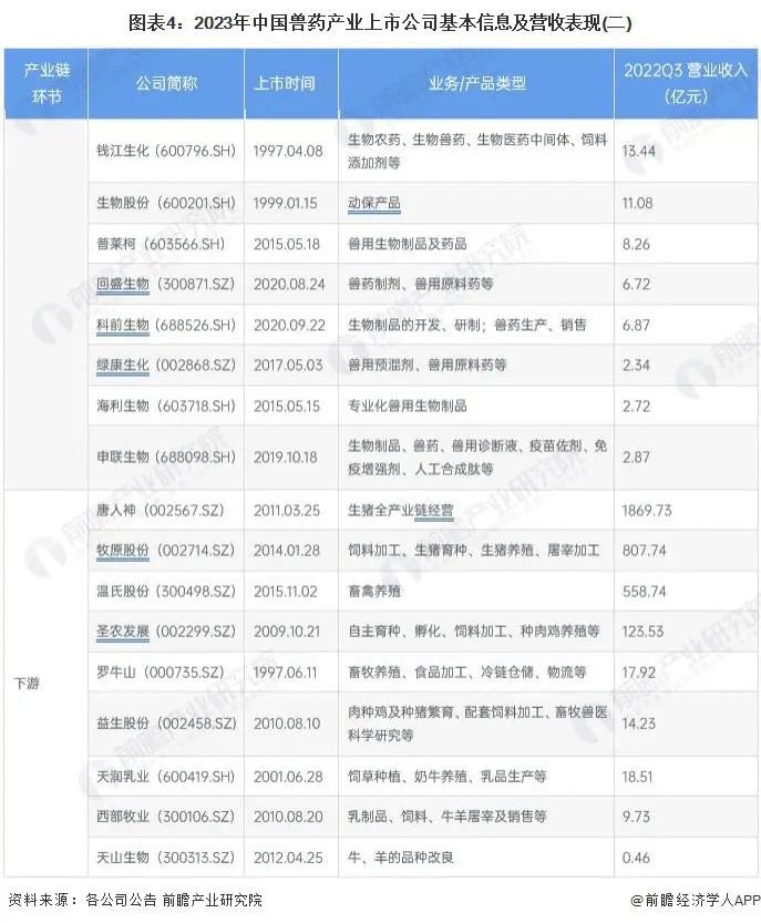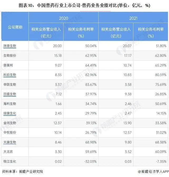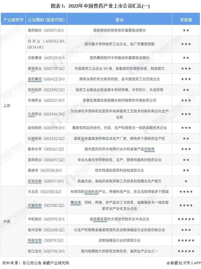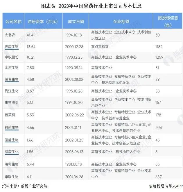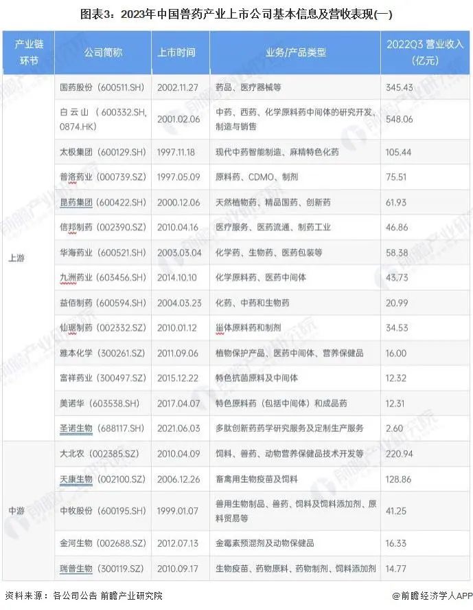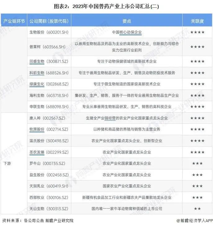 公司:瑞普生物 ( 300119 ) ;金河生物 ( 002688 ) ;中牧股份 ( 600195 ) ;钱江生化 ( 600696 ) ;生物股份 ( 600201 ) 等本文核心数据:兽药行业上市公司 ; 兽药行业上市公司基本信息 ; 兽药行业上市公司相关业务布局 ; 兽药行业上市公司相关业务业绩 ; 兽药行业上市公司相关业务规划等我国人口基数庞大,肉类食品作为饮食结构中的刚需之一,消费量大 ; 同时,随着居民收入水平提高,城镇化率提高,人民生活质量不断改善,养宠家庭比例也快速攀升,畜牧业与宠物业的巨大消费潜力带动兽药行业的发展。目前,我国兽药企业上市公司分布于上中下游各个环节。产业链上游涉及化学原料药、农副产品加工行业,主要包括白云山 ( 600332 ) 、信邦制药 ( 002390 ) 、昆药集团 ( 600422 ) 等 ; 中游为兽药行业,细分行业包括生物制品兽药、原料药及化学制剂及中药兽药,主要上市公司有瑞普生物 ( 300119 ) 、金河生物 ( 002688 ) 、绿康生化 ( 002868 ) 等兽药企业 ; 下游主要为养禽业、养猪业、牛羊养殖业等,上市公司主要包括圣农发展 ( 002299 ) 、唐人神 ( 002567 ) 、西部牧业 ( 300106 ) 等。根据兽药行业上市公司已有公开信息,注册资本规模最大的是大北农,超过 41 亿元,成立时间也较早。招投标信息最多的是中牧股份,其中 2023 年 3 月就有多项动物疫病免疫疫苗项目中标。行业内大多数上市公司被评为高新技术企业,企业技术中心等,也有四家企业被评为专精特新企业,整体来说都具备良好的科技创新能力。注:1 ) 招投标数据统计截至 2023 年 3 月。整理兽药行业上市公司已有的公开信息,持有专利数最多的是大北农,截至 2023 年 3 月共有 924 项专利,其中使用新型和发明授权分别为 393 和 328 项。同时,大北农的员工总数同样在业内最多,截至 2021 年年底已超过 2 万人。我国兽药行业上市公司中,瑞普生物、生物股份、普莱柯、科前生物、申联生物的兽药相关业务收入占比达到 90% 以上,是公司的最主要业务,产品线也更为丰富完整,各公司的销售基本都在国内实现,出口业务占比较小。注:1 ) 生物股份数据来自 2021 年年报,其余各公司数据来自 2022 年半年报。在兽药行业上市公司中,瑞普生物兽药相关营业收入最高,2020 及 2021 年均达到 20 亿元,生物股份、普莱柯 2021 年相关收入也达到 10 亿元。从利润情况来看,兽药行业整体毛利率较高,科前生物与申联生物毛利率高达 75% 以上,也有部分企业相关业务毛利率超过 60%。注:1 ) 金河生物毛利率以兽用药物添加剂为代表列示 ;2 ) 大北农毛利率以兽药产品为代表列示。兽药行业上市公司对于兽药相关业务的规划主要集中于研发能力、技术水平的提升,并积极与科研单位合作,此外也包括扩大产能、对外投资、拓展海外业务等,以巩固核心竞争力。本文源自前瞻产业研究院《中国兽药行业发展前景预测与投资战略规划分析报告》,仅供参考,不作为投资依据。本文源自前瞻产业研究院 精编整理,公益分享,不以赚取任何商业利益为目的,版权归属原作者,在此向转载平台与作者致谢,如涉及侵权,本平台立即删除并致歉。