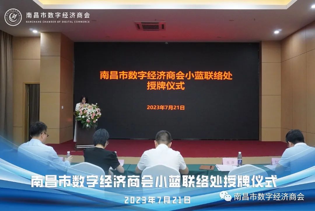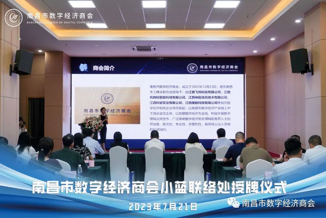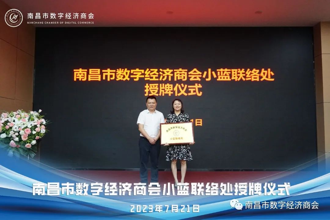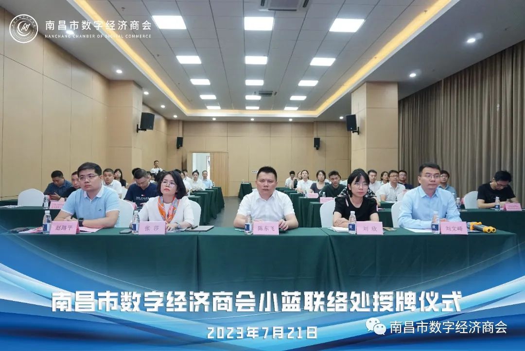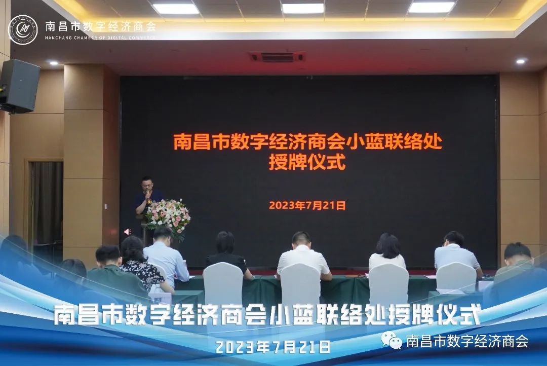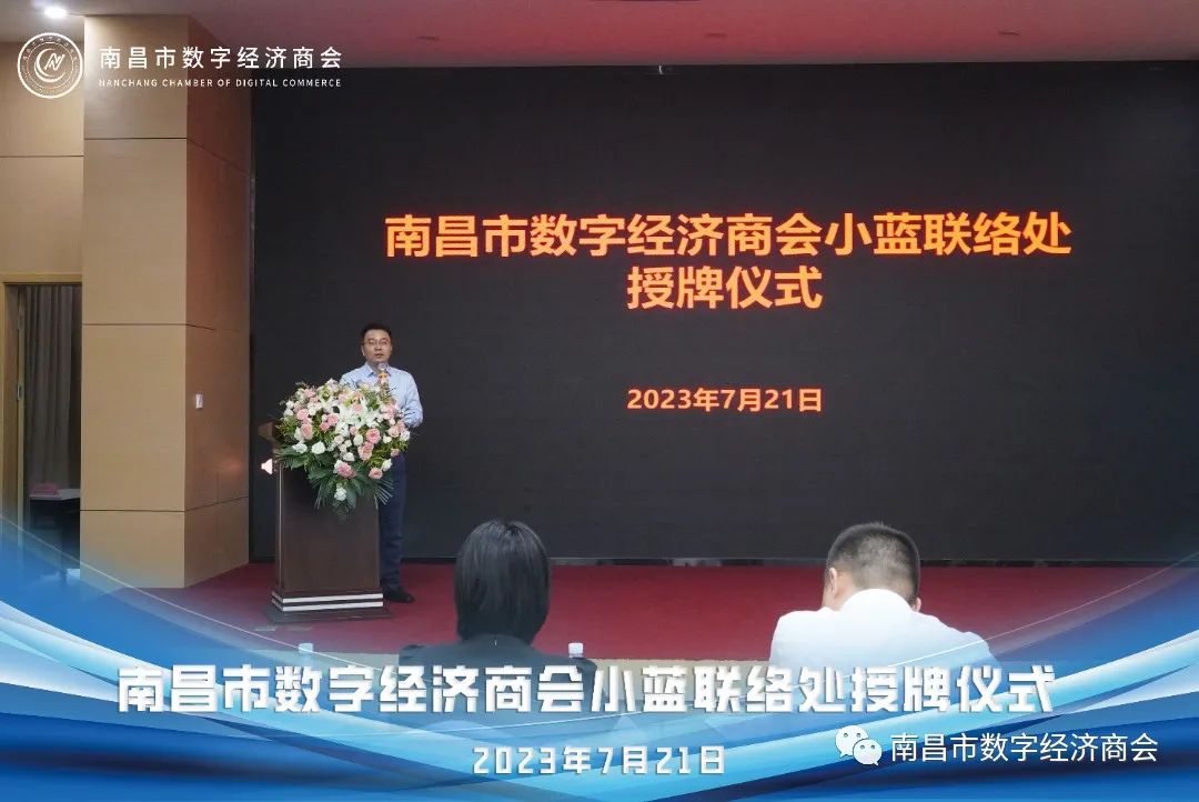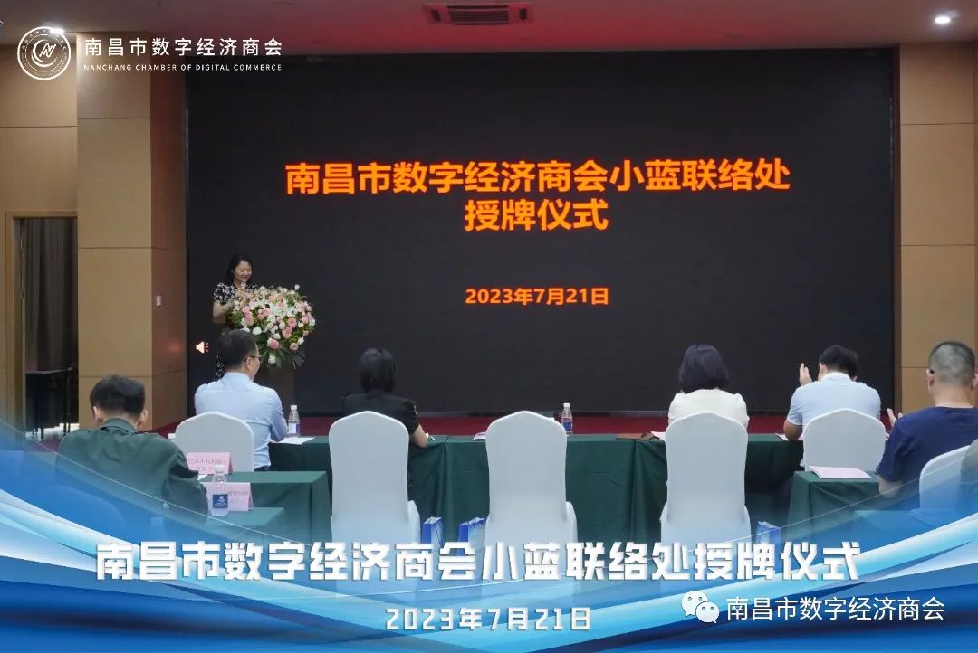 伴随着热烈的掌声,南昌市工商联陈主席为南昌市数字经济商会小蓝联络处负责人授牌。此举标志着商会小蓝联络处正式成立。联络处的成立将为南昌市数字经济的发展注入新的动力,促进数字经济建设的进一步发展,为辖区企业提供更好的服务和支持。商会作为政府与企业的沟通桥梁,促进政府与企业之间的有效沟通,同时积极对接企业需求,提供交流平台和协调解决问题,为南昌市数字经济的发展提供重要支撑。