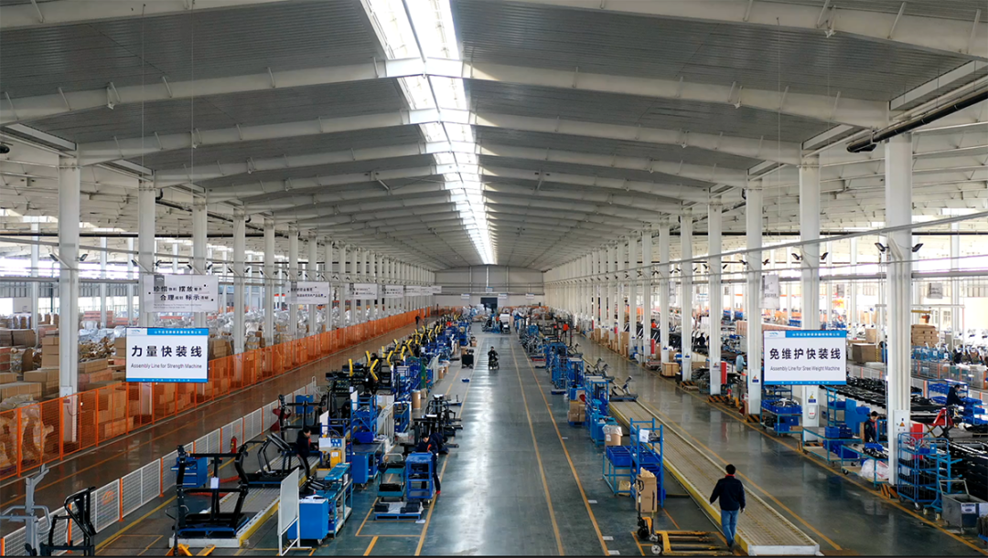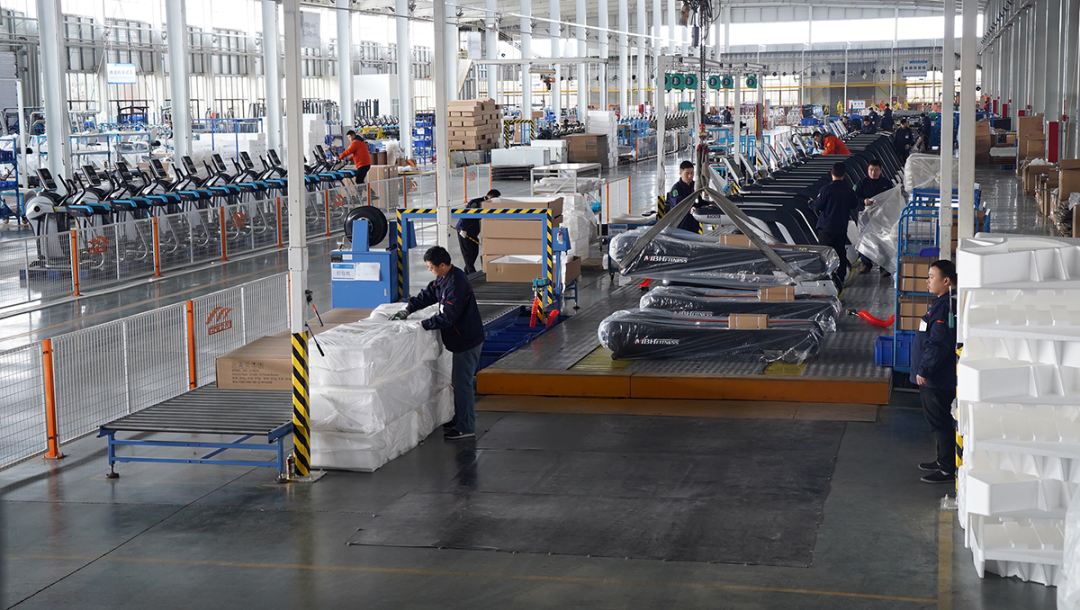 在偌大的迈宝赫现代化生产车间内,机器轰鸣,一片繁忙景象。高度自动化的生产线、干净整洁的环境、井井有条的生产环节……从焊接到喷涂再到组装,一辆辆叉车将包装好的健身器材放好,一台台跑步机、单车机、力量器材就这样等待着被运往世界各地。