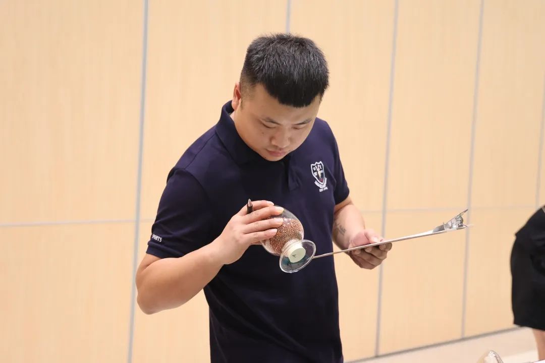 车间里,晾堂旁,一口口甑锅蒸汽腾腾,第二天的实操现场上,选手们互相配合,谨记上甑“轻、松、薄、准、匀、平”原则,一担担装满酒醅的箢篼在比赛选手们手中挥洒自如,一粒粒经过反复蒸煮的红樱子糯高粱被轻抛匀撒地铺满甑锅,娴熟而标准的动作,展现出的是他们日积月累的背后功夫。