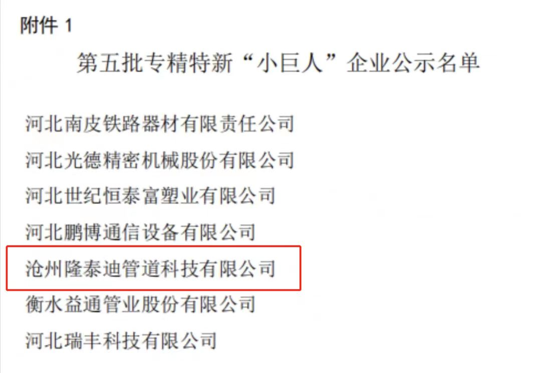 近日,河北省工信厅发布了《关于河北省第五批专精特新“小巨人”企业和第二批专精特新“小巨人”复核通过企业名单的公示》,沧州隆泰迪管道科技有限公司上榜河北省第五批专精特新“小巨人”企业。
