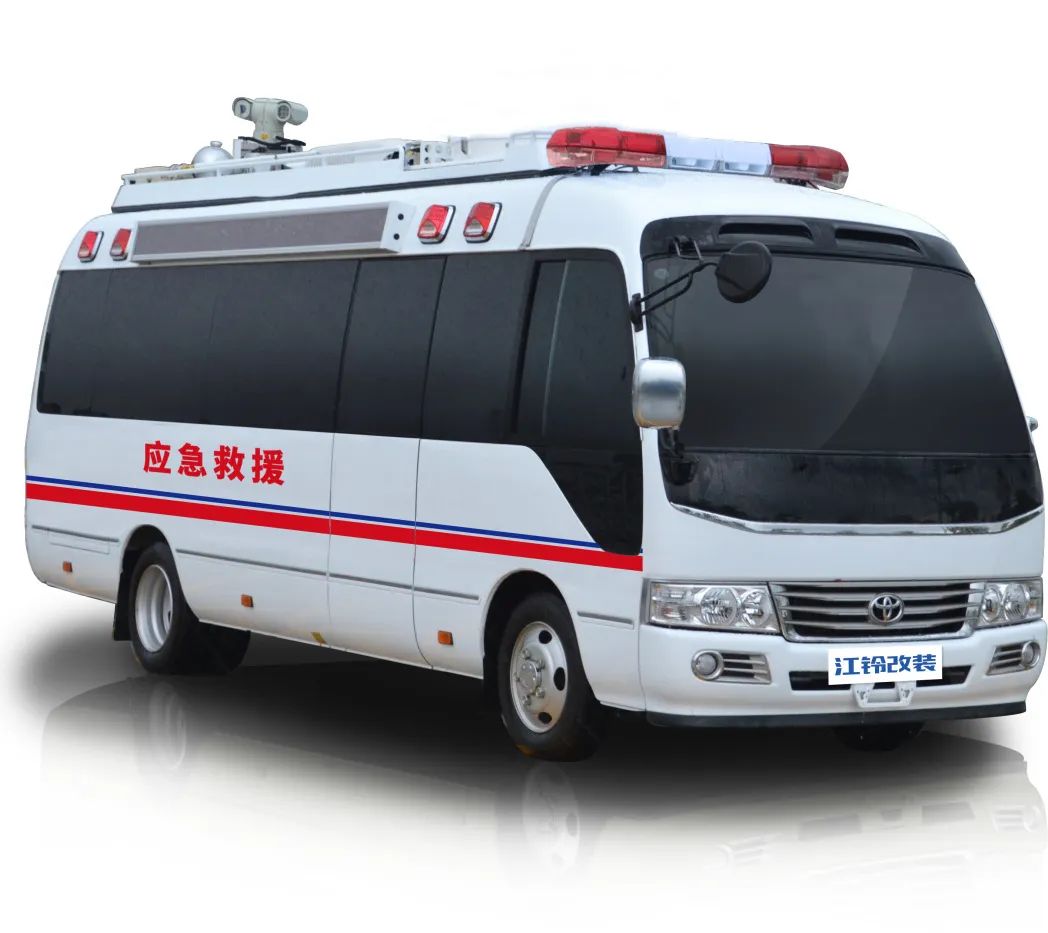 采用考斯特底盘改装,配备警示、卫星通讯、视频会议系统等设备,在应急管理部门紧急情况时,通信指挥车能够保障通信,快速构建指挥中心和现场的音视频传输通道,实现可视化指挥,为抢险救灾提供强有力的技术支撑。