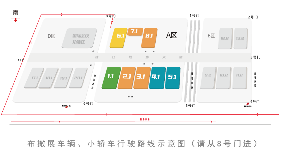 ▶距离广交会展馆A区最近的是6号门、8号门和5号门。自驾出行优选靠近停车场的8号门,地铁/公交优选6号门。(往下翻看交通指引)(您需要注意:出租车只能在展馆A区展场中路出租车上客通道客点上落客,其他路段不允许上落客。)