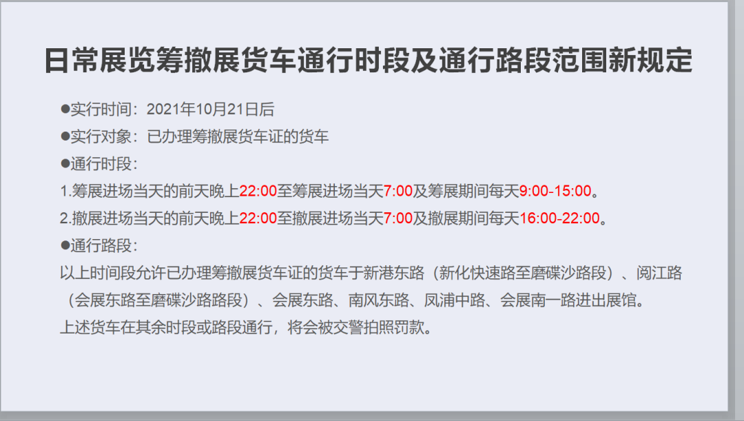 4、货车司机请注意:日常展览筹撤展货车通行时段及通行路段范围新规定: