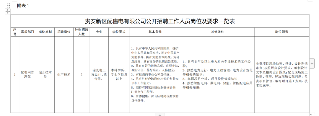 招聘岗位职责详见附表1“贵安新区配售电有限公司2023年7月招聘人员岗位及要求一览表”