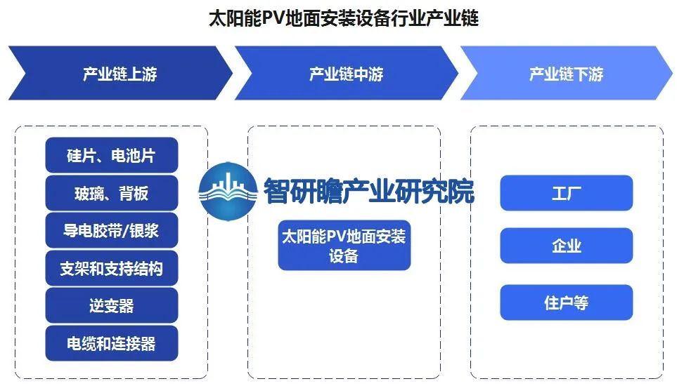 太阳能PV地面安装设备行业上游主要是原材料,包括硅片、玻璃、背板、电池片等。中游为系统集成商,下游包括工厂、企业、住户等需要使用太阳能光伏发电系统供电的用户。