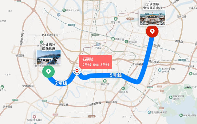 栎社机场搭乘地铁2号线,在石碶站换乘5号线,在会展中心站B口出站