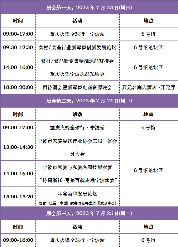2023浙江国际餐饮业博览会定于7月23-25日在宁波国际会展中心举行。展会由食材/食品、水产贸易、预制菜、餐饮美食、酒水饮料、农副产品、冷链配送七大版块组成,展出面积达2万M²。届时,将有来自国内外300+展商,以浙江为主来自全国的50000+专业观众(买家)包括酒店/餐饮机构、生产加工贸易企业、生鲜超市、连锁企业、社区配送、电子商务交易平台、冷链配送等专业人士和公众参会交流洽谈贸易合作。同期举行多场配套活动,助力展会和与会人士取得丰硕成果。
