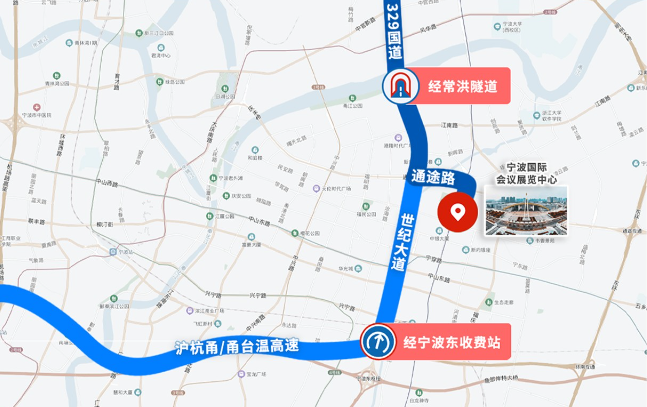 经常洪隧道沿世纪大道往南,至通途路左转约150米,即达宁波国际会展中心北门