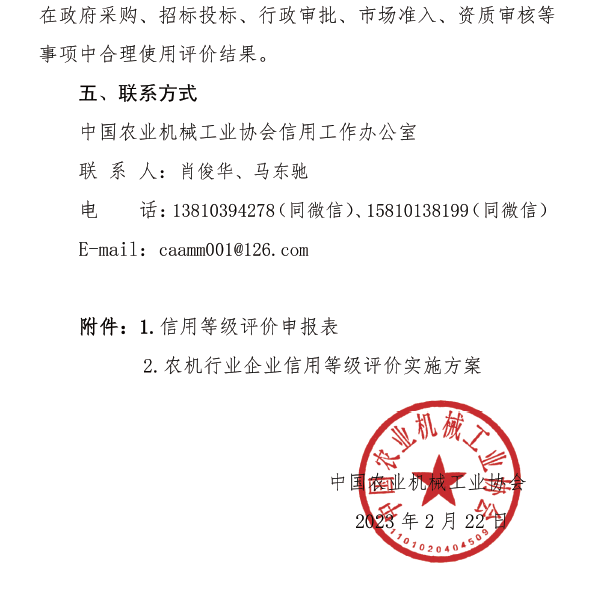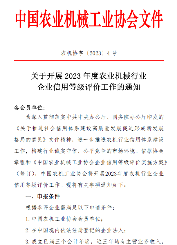 关于开展2023年度农业机械行业企业信用等级评价工作的通知