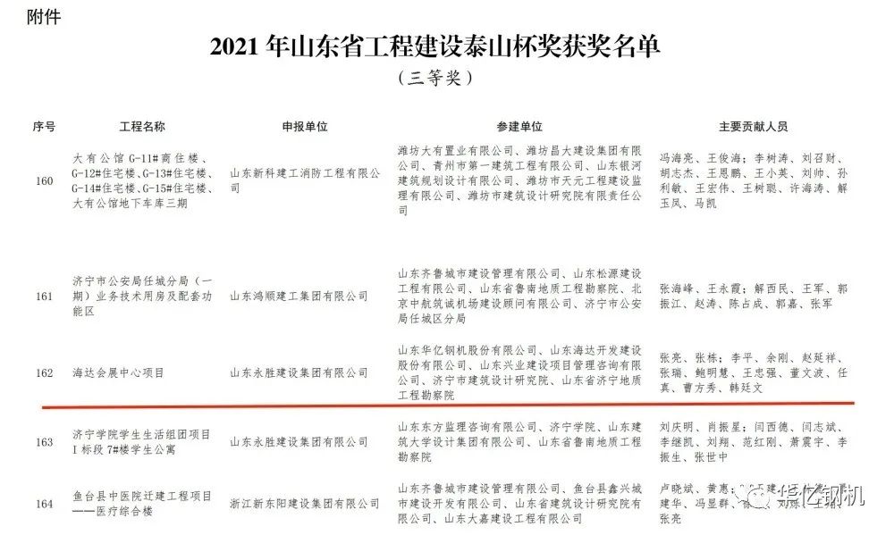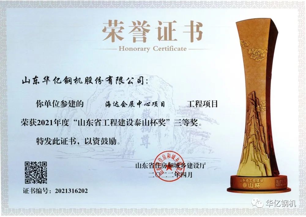 近日,山东省住房和城乡建设厅对2021年度“山东省工程建设泰山杯奖”获奖工程颁发了荣誉证书。公司承建的海达会展中心项目荣获2021年度“山东省工程建设泰山杯”三等奖。这是继泰山文旅健身中心建设项目幕墙工程施工三标段工程荣获“2021-2022年度中国建筑工程装饰奖”后,再次获得省级以上建筑类表彰。“泰山杯奖”是山东省建筑行业工程质量方面的最高荣誉奖,该奖项的获得也是对公司项目项目建设工作的充分认可。