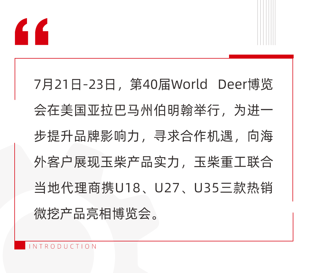 近年,玉柴重工海外销售业务迅猛发展,北美洲作为玉柴重工最为重要的海外市场之一,其产品深受当地客户的青睐与喜爱。此次玉柴重工产品亮相美国伯明翰,以其精美的外观、过硬的品质、高效的性能和舒适的体验,利用World Deer博览会的影响力,进一步扩大了玉柴品牌的影响力。结识了越来越多的海外新客户,同时,也挖掘出了更多的海外商机。