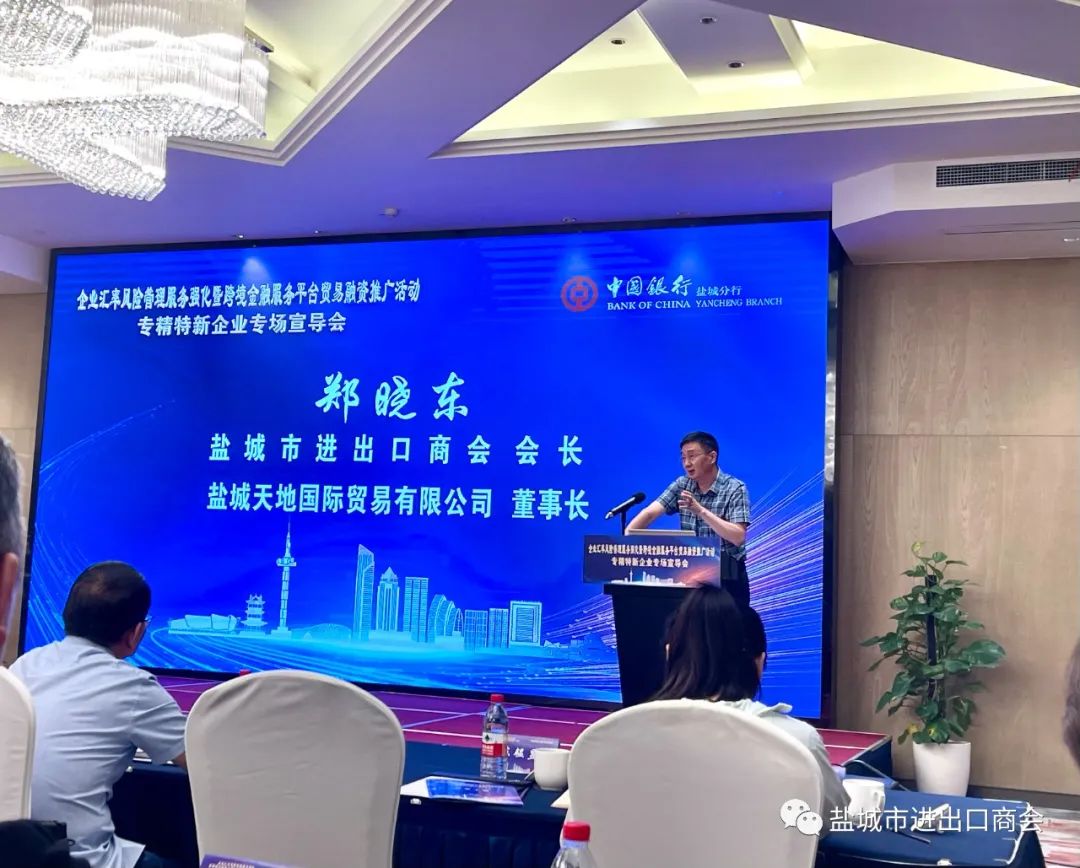 7月20日下午,由外管局盐城市中心支局主办,中国银行盐城分行承办,盐城市进出口商会协办的“企业汇率风险管理服务强化暨跨境金融服务平台贸易融资推广活动”专精特新企业专场宣导会在江苏港府君澜大饭店盛大开幕。来自省、市外管局、市商务局、市科技局、中国银行江苏省分行、盐城分行的相关领导、外汇自律机制基础成员单位负责人、企业家代表及盐城市进出口商会会长单位代表参加会议。