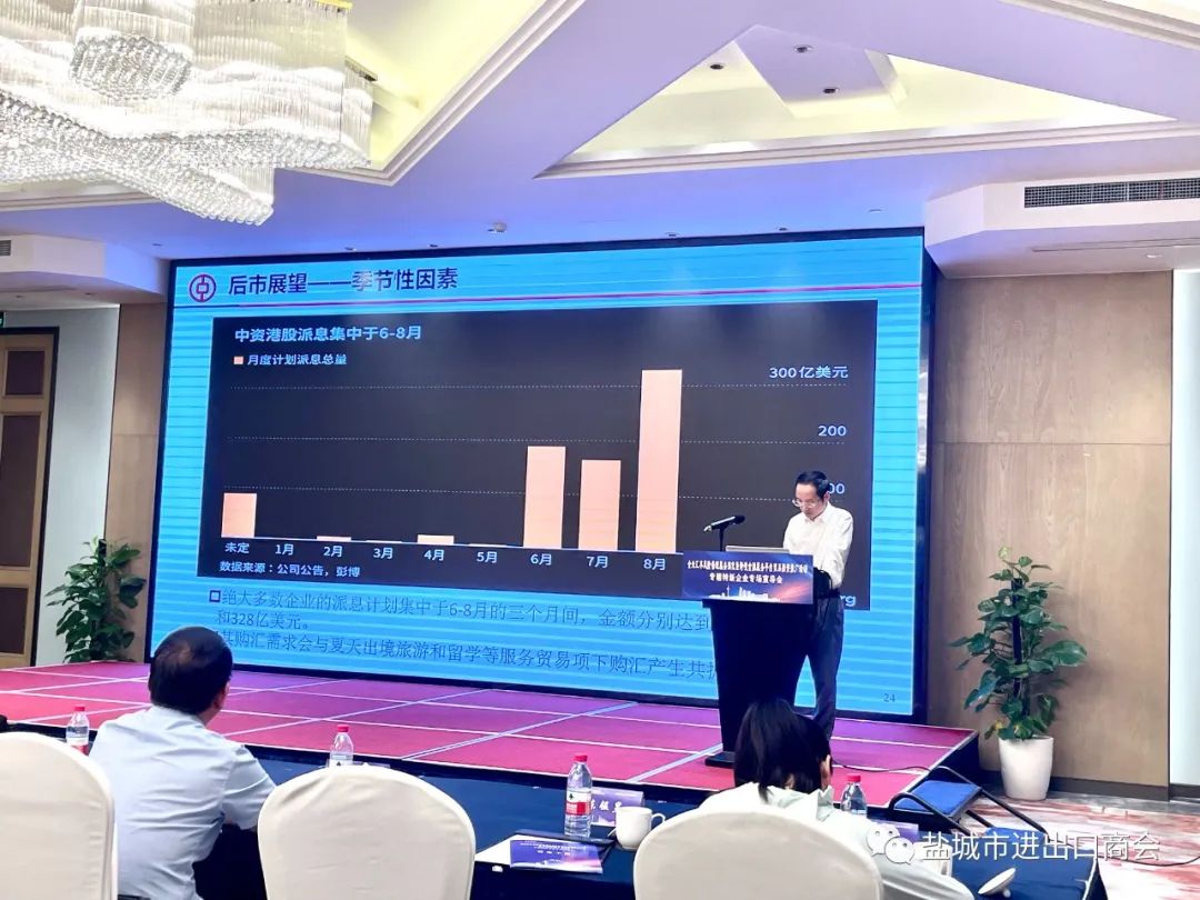 中国银行盐城分行丁秀梅副行长、 外管局盐城中心支局陈剑耀副局长、外管局江苏省分局陈标副处长分别致辞。市科技局陈处长宣导20条科技企业支持措施。中国银行江苏省分行资深外汇专家黄钰平先生用详实的图表和数据就近期汇率走势做了详尽的分析并从企业角度出发,介绍了相关套保产品。市进出口商会会长郑晓东作为企业代表发言:他从自己在外贸战线深耕三十年的老兵身份切入,以汇率走势的宏观发展到汇率波动对企业经营的影响阐述了实体企业家对汇率风险管理的理解和一些实际操作,并建议大家在当前复杂经济形势下,坚持汇率风险中性理念,理性看待汇率波动,聚焦主业,杜绝汇率投机,正确对待汇率波动起伏,放弃贪婪心理,及时锁定利润。会后交流,与会领导、专家和嘉宾对郑会长的发言表示了肯定和认同。