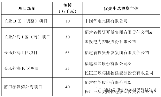 福建能源集团&三峡集团:95万千瓦、福建投资开发集团:65万千瓦、福建投资开发集团&国投集团:30万千瓦、华电集团:10万千瓦