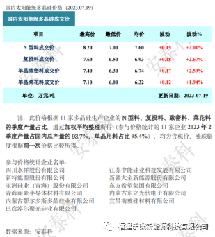 N型料:成交价7.00-8.20万元/吨,均价7.60万元/吨,均价周环比上涨2.01%。
