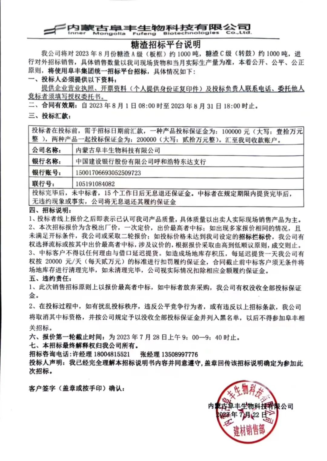 我公司将对2023年8月份糖渣A级(板框)约1000吨,糖渣C级(转鼓)约1000吨,进行对外招标销售,具体销售数量以我司现场货物和当月实际生产量为准,本着公开、公平、公正原则,将使用阜丰集团统一招标平台招标,具体情况如下: