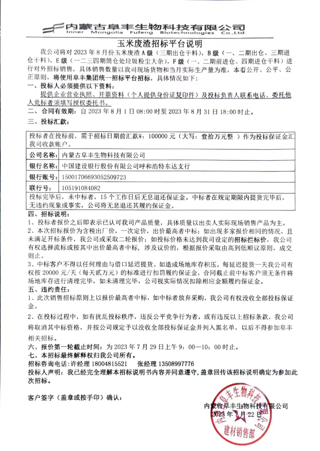 我公司将对2023年8月份玉米废渣A级(三期出仓干料),B级(一、二期出仓、三期进仓干料),E级(一二三四期筒仓处垃圾粉尘大杂),F级(一、二期前进仓、四期进仓干料)进行对外招标销售,具体销售数量以我司现场货物和当月实际生产量为准,本着公开、公平、公正原则,将使用阜丰集团统一招标平台招标,具体情况如下: