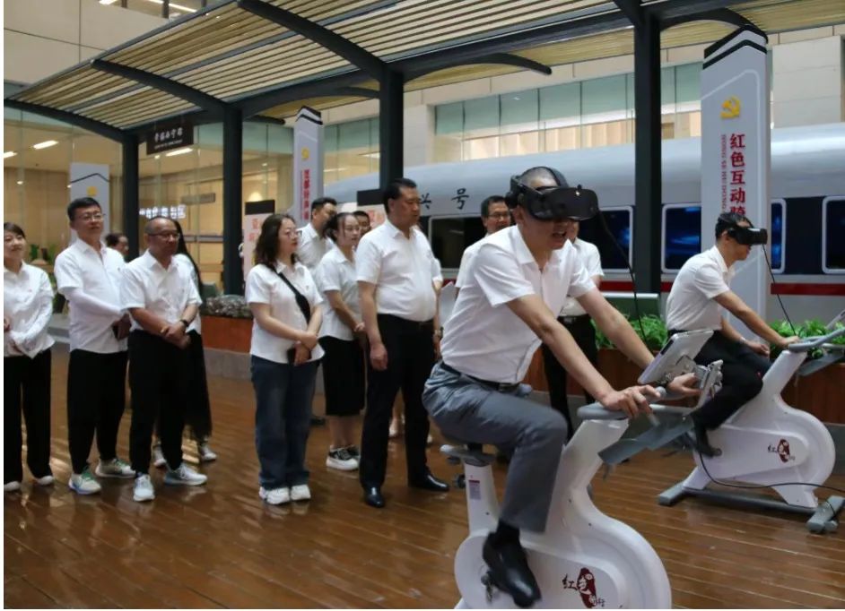 首先,全体党员随着讲解员的脚步来到了党群接待厅、红色服务悦享区,将党员组织关系接转、党费收缴、流动党员服务、党员群众来电来信来访接待等作了详解,VI照片合成、红色骑行VR眼镜、复兴号列车教育基地展示、文创工艺品区、体检功能区等区域,全新的智能体验让参观党员流连忘返、参与其中。