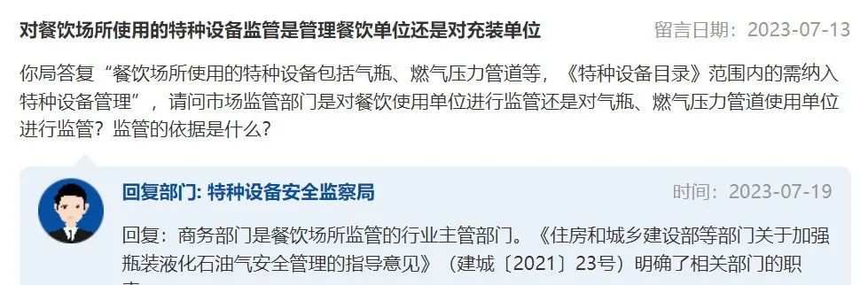 回复:商务部门是餐饮场所监管的行业主管部门。《住房和城乡建设部等部门关于加强瓶装液化石油气安全管理的指导意见》(建城〔2021〕23号)明确了相关部门的职责。
