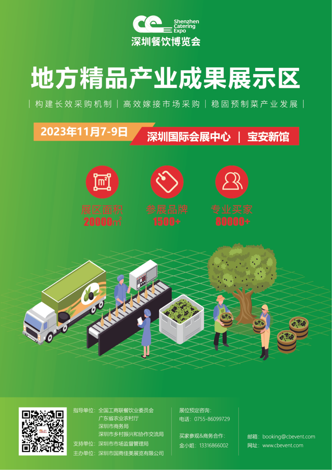 从最初的地方农业扶贫,发展到推进多年的乡村振兴模式,深圳餐饮博览会组委会也在不断探索带动地方农业产业发展创新模式。当下,随着各地方农业产业如火如荼的发展,开始涌现出“一乡一品、一镇一业”的乡村新产业新业态。因此第六届深圳餐博会将重磅推出“地方精品产业成果展区”,不仅全面展销地方特色食材,引导大湾区餐饮企业与地方产地的长效采购对接,同时更引导大湾区各类社会资本、技术,人才,与个地方农业产业集群开展更多更高维度的产业协作,培育特色优质农业品牌、助推农业产业转型升级,助力地方打造高质量预制菜产业集群、打通更大更广阔的市场,推动“一乡一品、一镇一业”的高质量可持续发展。
