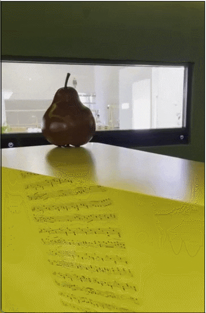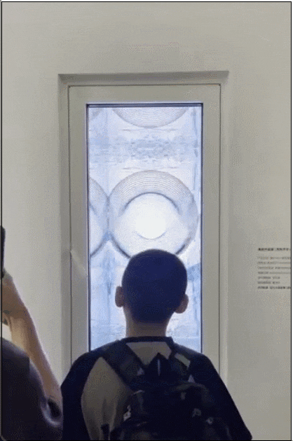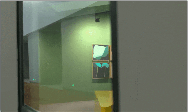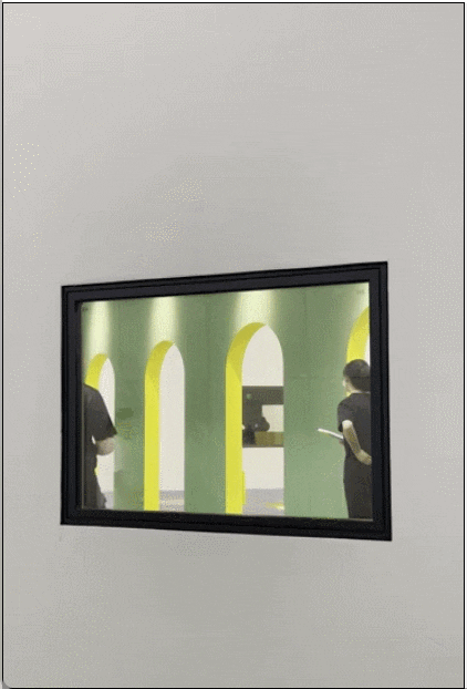 看起来好像是两扇普通的窗户,其实不然,打开窗户我们能看到条纹与菱格纹快速交叉跳动的大屏,同时还能听到许多杂乱的声音。