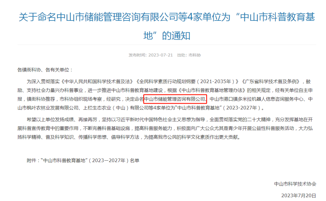 7月21日,中山市科学技术协会正式发布了《关于命名中山市储能管理咨询有限公司等4家单位为“中山市科普教育基地”的通知》,命名中山市储能管理咨询有限公司(中山创业创新港)为“中山市科普教育基地”。中山市储能管理咨询有限公司将坚持以习近平新时代中国特色社会主义思想为指导,全面贯彻落实党的二十大精神,充分发挥基地在开展科普宣传教育中的重要作用,不断完善科普基础设施,提高科普服务能力,积极面向广大公众尤其是青少年开展公益性科普服务活动,大力弘扬科学精神、普及科学知识、传播科学思想、倡导科学方法,为提高我市公民的科学文化素质做出力所能及的贡献。同时将积极推动德堡零科技等在孵企业参与社会科普教育工作,引导企业践行社会责任,厚植创新沃土,进一步推动东凤镇形成新时代科学普及与科技创新两翼齐飞、协同发展的良好局面;通过承办创新创业大赛和各类项目路演,吸引科技人员创业,促进科研成果转化,通过科普培育大众的科学素养,以线下和线上相结合、培训和服务相结合等方式,为全市科技创新营造良好的氛围。中山创业创新港由专业团队运营,全新辟建联合办公、会议中心、孵化中心、商学院、小家电直播基地;依托东凤强大的产业基础和尚悦广场商圈完善的生活配套设施及停车服务;主要孵化科技创新、数字信息、电子商务、文化创意、教育培训、产业配套等新业态;引进银行、投资机构、财税法务、政策申报、营销策划等战略合作机构,聘任创业导师导入资源赋能创业者,建立中小企业服务平台和电商服务平台,构建全生命周期孵化育成体系,促进东凤乃至中山北部的产业优化升级和城市价值提升。