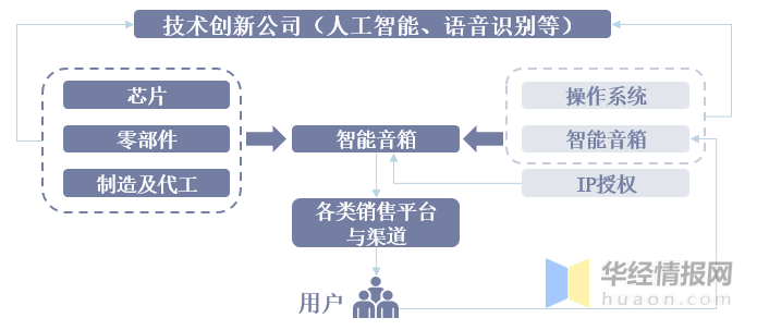 智能音箱产业链较长,包括上游的硬件商、软件服务商,中游的内容商、方案商、代工商,以及下游的品牌商。核心技术主要有四个方面,硬件层面的芯片技术和麦克风阵列技术(语音识别的硬件支持),以及软件层面的语音识别技术和语义理解技术,在国内大部分中文的语音识别技术则由科大讯飞所提供。