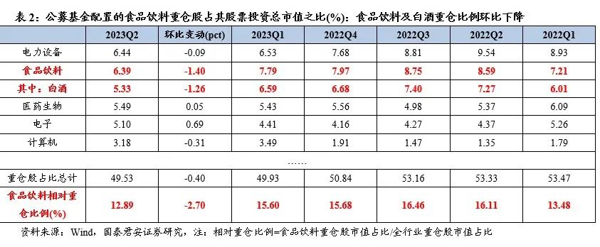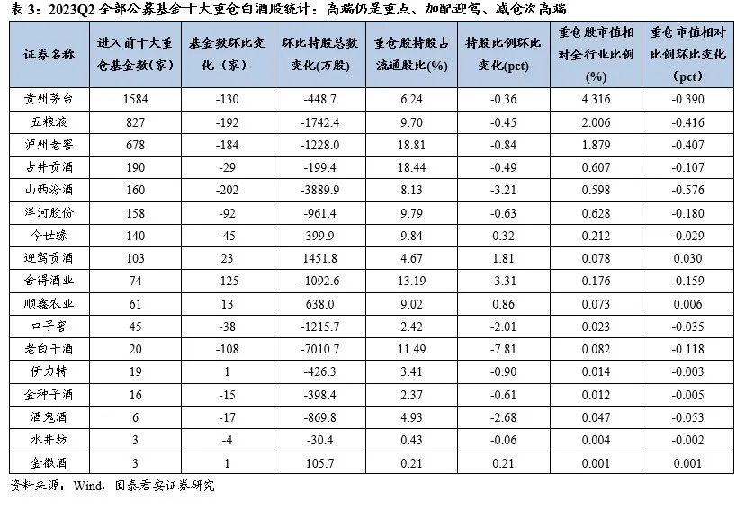 Q2基金持仓分析:重仓环比下降,高端仍是重点、加配迎驾、减仓次高端。2023Q2公募基金食品饮料重仓比例6.39%,环比Q1下降1.40pct,Q2食品饮料相对重仓比例12.89%,环比Q1下降2.70pct。白酒板块仍是配置重点子行业,Q2公募基金重仓比例5.33%,环比Q1下降1.26pct,重仓比例处于近几个季度低点。高端白酒仍为持仓核心,贵州茅台、五粮液、泸州老窖重仓基金/重仓市值相对全行业比例分别为1584家/4.32%、872家/2.01%、678家/1.88%,但环比均有下降;区域白酒整体持仓波动较小,其中迎驾贡酒是为数不多的Q2机构加仓白酒股,Q2重仓基金103家、环比增加23家,重仓市值相对全行业比例0.08%、环比提升0.03pct。次高端白酒普遍减仓,重仓比例环比下降。