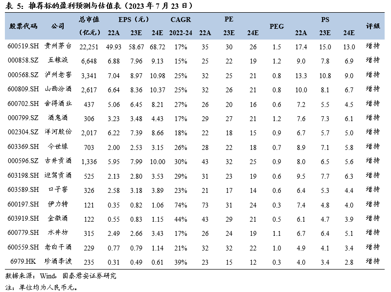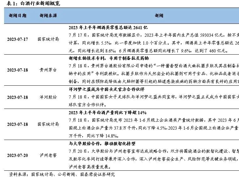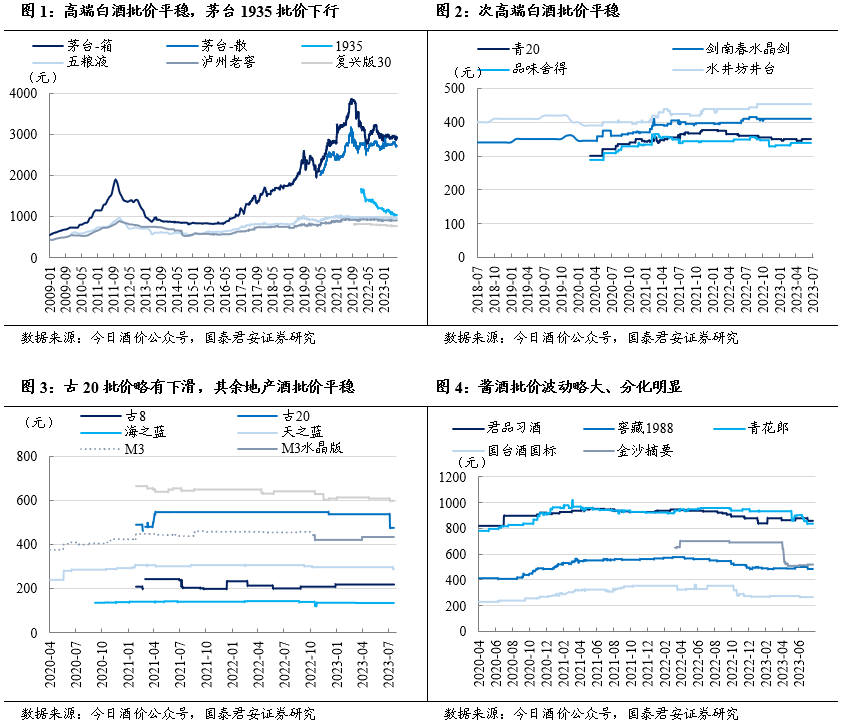 高端白酒渠道跟踪:价盘平稳、稳健运行,时间过半、任务过半。1)茅台:整箱飞天批价2920-2930元,散瓶飞天批价保持2720元,淡季批价保持平稳,7月配额有序执行。近期茅台酱香酒公司召开半年营销会,2023年上半年酱香系列酒保持高质量发展态势、顺利完成了“双过半”目标任务。2)五粮液:批价940-950元左右,近期五粮液集团召开2023年上半年工作总结,上半年生产经营目标圆满完成,未来将进一步把握白酒行业宴席市场、老酒市场、国际市场发展新趋势实现顺势而上。3)国窖:高度批价890-900元,批价保持稳定,春雷行动积极拉动回款,市场基础网点开发、终端陈列建设等情况完成良好。