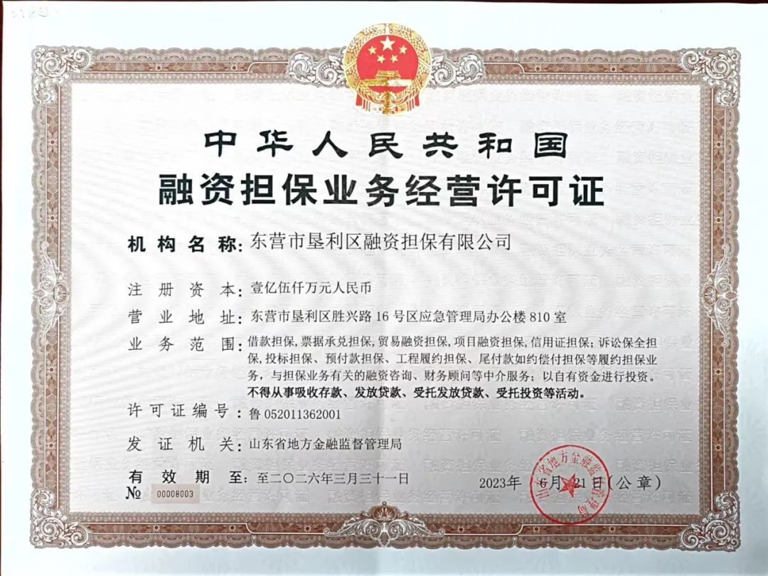 新的东营市垦利区融资担保有限公司注册资本1.5亿元,资产优良,主营业务涵盖贷款担保、票据承兑担保、贸易融资担保、项目融资担保、信用证担保、诉讼保全担保、投标担保、预付款担保、工程履约担保、尾付款如约偿付担保等履约担保业务等。
