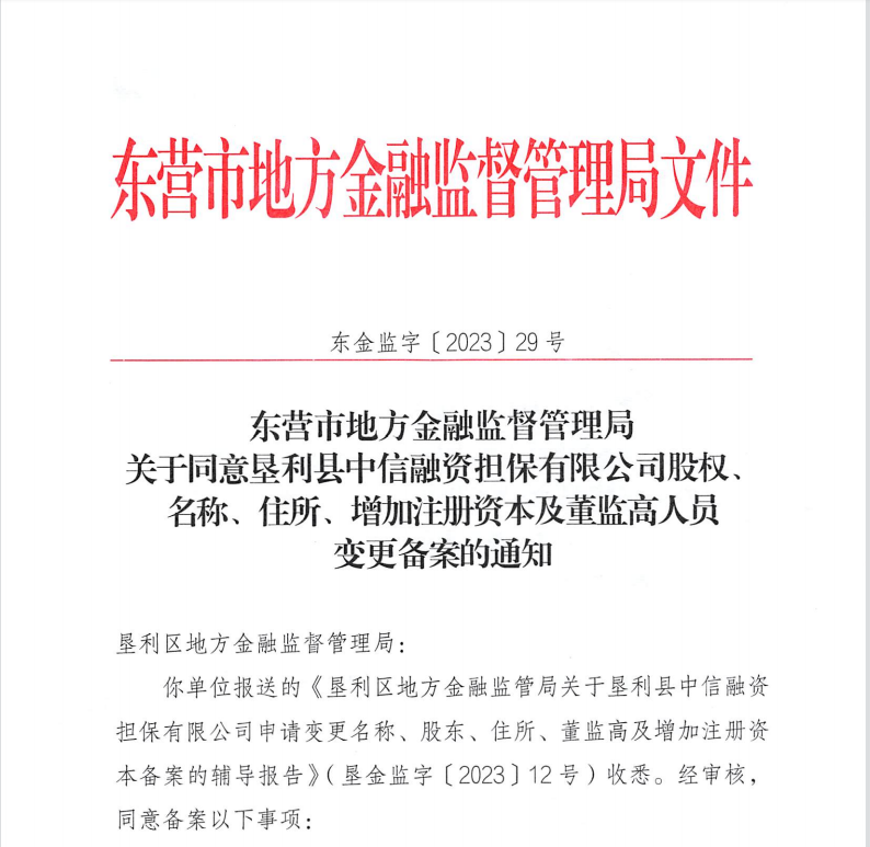 近日,区财金集团先后收到了省、市地方金融监管部门下发的《融资担保业务许可证》(鲁052011362001号)和《关于同意垦利县中信融资担保有限公司股权、名称、住所、增加注册资本及董监高人员变更备案的通知》(东金监字〔2023〕29号),标志着区融担保公司正式恢复运营,终结了垦利区无融资担保机构的历史。