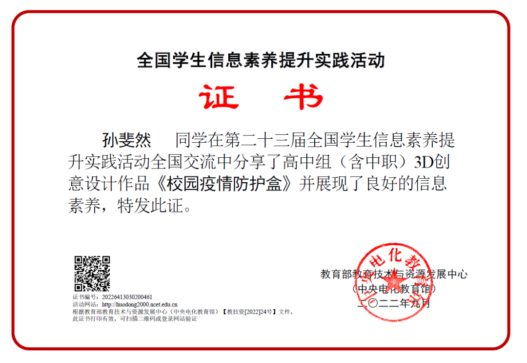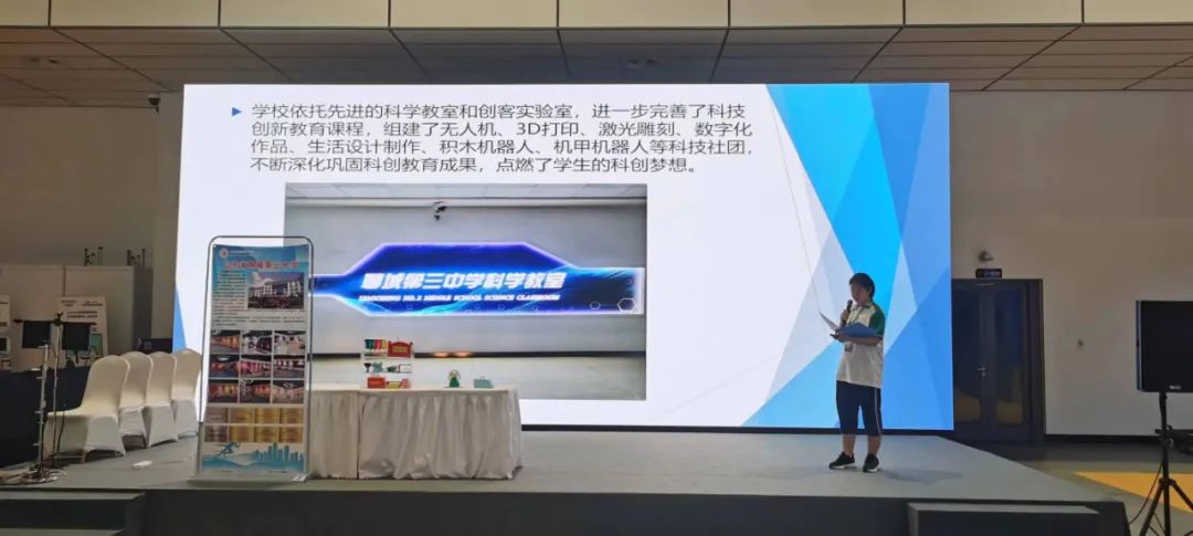 7月21日至23日,2023山东省教育装备博览会在山东国际会展中心隆重举行,我校受邀参加并携师生亮相活动现场。本届教博会由山东省教育厅、济南市人民政府共同主办,山东省教育发展服务中心、济南市教育局承办。7月22日,我校学生孙斐然在博览会的中小学科技作品展示活动中,进行作品展示。我校作为聊城市唯一代表参加创新教育成果展示,孙斐然同学展示的作品为《基于3D打印技术的创意作品——校园疫情防护盒、摩天轮式停车场等》,通过构造展示,全面地表现了该作品的功能,最后通过视频介绍了我校依托科学教室和创客实验室开展的创新教育课程,获得与会师生的一致赞赏。此作品曾在第二十三届全国学生信息素养提升实践活动交流中做分享,充分展现了我校学生较高的创新能力和信息素养。