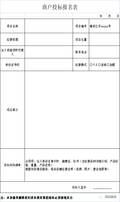 4.需提交将要经营项目的项目方案、策划书及投标店铺号,并根据经营项目对营业额进行预估。