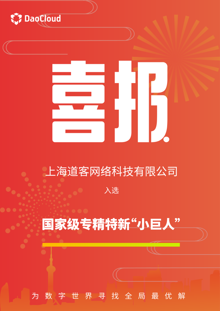 2023 年 7 月 14 日- 7 月 20 日,上海市经济和信息化委员会对第五批专精特新“小巨人”入选企业名单予以公示。凭借在云原生领域的创新技术优势和广泛的市场认可,「DaoCloud 道客」从众多参评企业中脱颖而出,荣膺国家级专精特新“小巨人”企业称号。这是继入选“上海市专精特新中小企业”和“上海市科技小巨人”之后,「DaoCloud 道客」发展征程上的又一重磅殊荣。